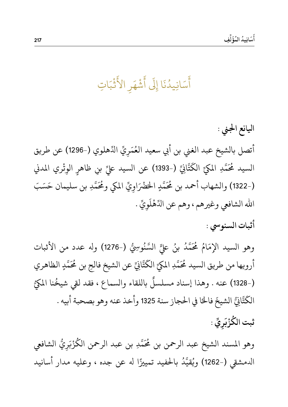 وهو السيد الإِمَامُ مُحَمَّدُ بنُ عليٍّ السَّنُوسِيُّ (-١٢٧٦) وله عدد من الأثبات أرويها من طريق السيد مُحَمَّدِ المكيِّ الكَتَّانِيِّ عن الشيخ فالحِ بن مُحَمَّدٍ الظاهري (-١٣٢٨) عنه. وهذا إسناد مسلسلٌ باللقاء والسماع، فقد لقي شيخُنا المكيُّ الكَتَّانِيُّ الشيخَ فالحًا في الحجاز سنة ١٣٢٥ وأخذ عنه وهو بصحبة أبيه.