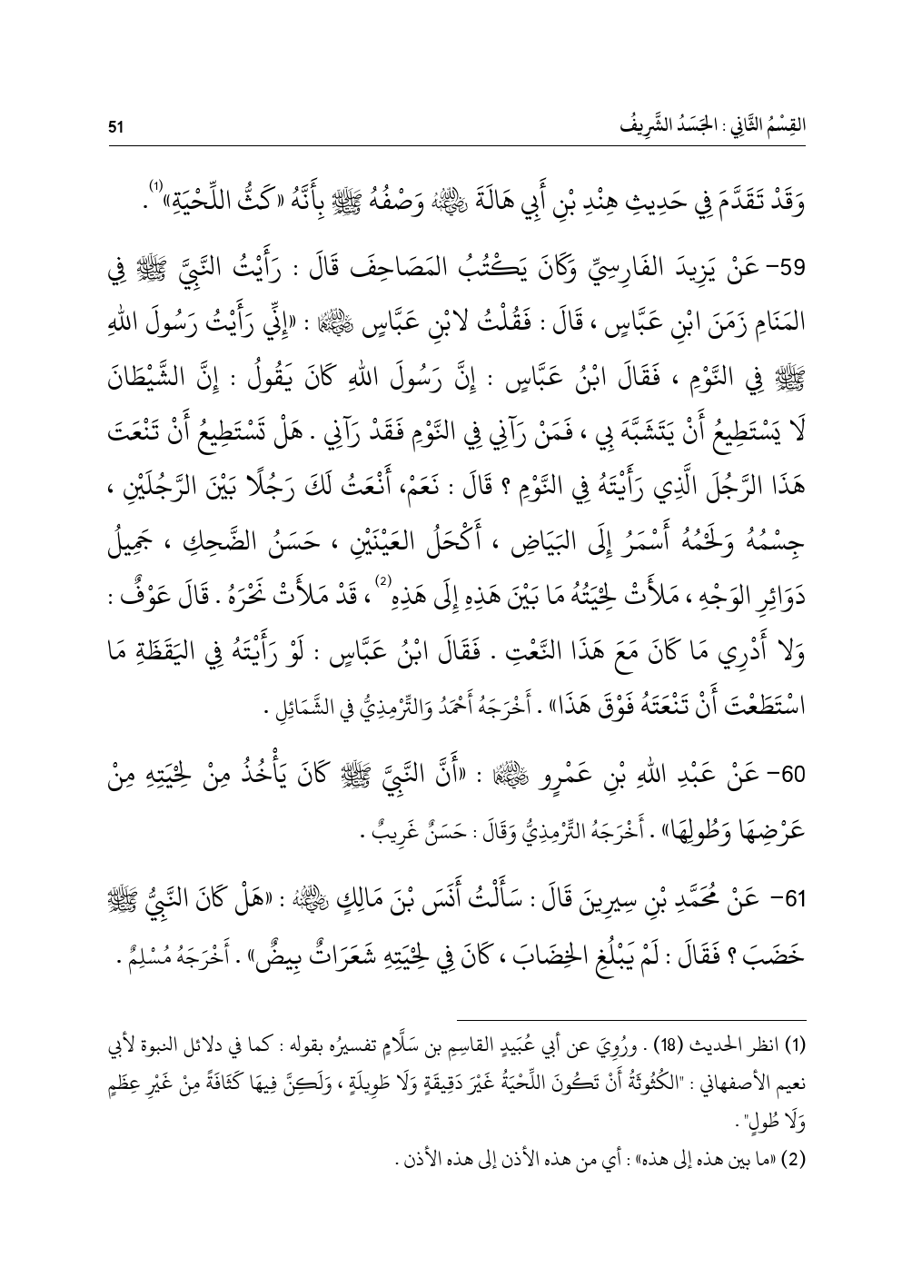 ٦١ - عَنْ مُحَمَّدِ بْنِ سِيرِينَ قَالَ: سَأَلْتُ أَنَسَ بْنَ مَالِكٍ - رضي الله عنه -: «هَلْ كَانَ النَّبِيُّ - صلى الله عليه وسلم - خَضَبَ؟ فَقَالَ: لَمْ يَبْلُغِ الخِضَابَ، كَانَ فِي لِحْيَتِهِ شَعَرَاتٌ بِيضٌ». أَخْرَجَهُ مُسْلِمٌ.