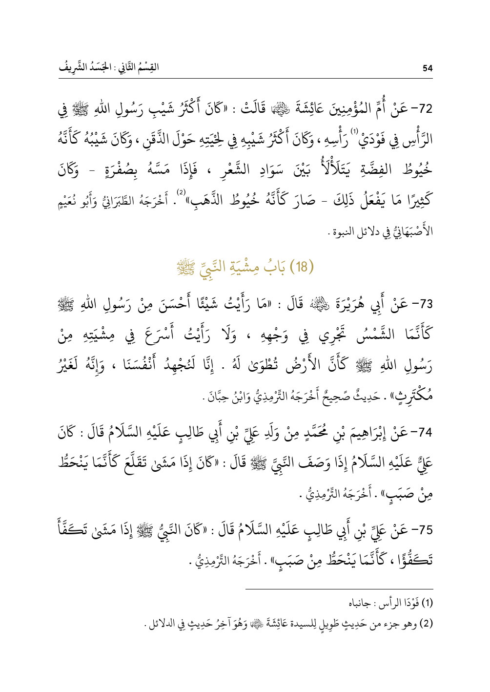 ٧٤ - عَنْ إِبْرَاهِيمَ بْنِ مُحَمَّدٍ مِنْ وَلَدِ عَلِيِّ بْنِ أَبِي طَالِبٍ عَلَيْهِ السَّلَامُ قَالَ: كَانَ عَلِيٌّ عَلَيْهِ السَّلَامُ إِذَا وَصَفَ النَّبِيَّ - صلى الله عليه وسلم - قَالَ: «كَانَ إِذَا مَشَى تَقَلَّعَ كَأَنَّمَا يَنْحَطُّ مِنْ صَبَبٍ». أَخْرَجَهُ التِّرْمِذِيُّ.