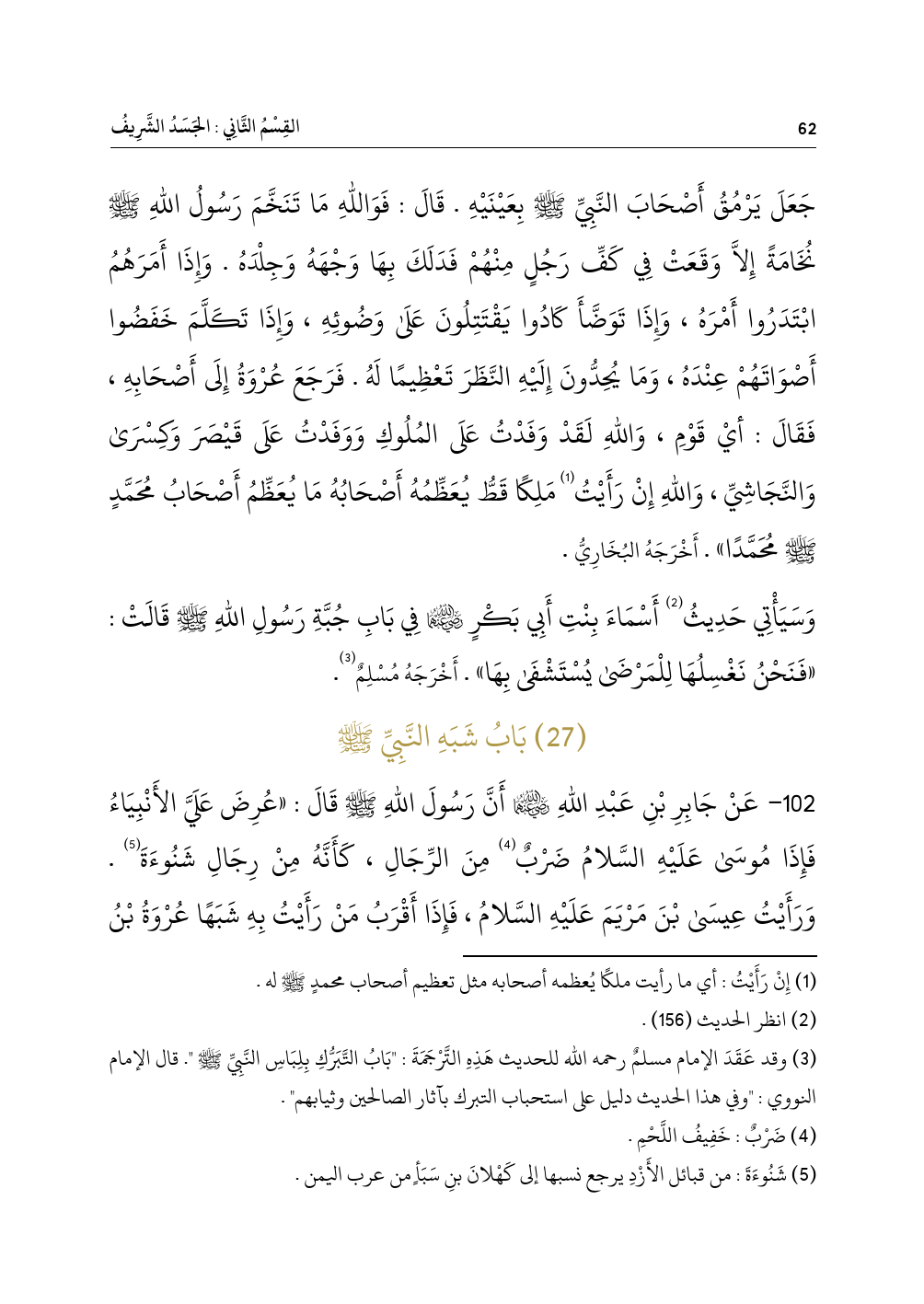 ١٠٢ - عَنْ جَابِرِ بْنِ عَبْدِ اللهِ - رضي الله عنهما - أَنَّ رَسُولَ اللهِ - صلى الله عليه وسلم - قَالَ: «عُرِضَ عَلَيَّ الأَنْبِيَاءُ فَإِذَا مُوسَى عَلَيْهِ السَّلامُ ضَرْبٌ (¬٤) مِنَ الرِّجَالِ، كَأَنَّهُ مِنْ رِجَالِ شَنُوءَةَ (¬٥). وَرَأَيْتُ عِيسَى بْنَ مَرْيَمَ عَلَيْهِ السَّلامُ، فَإِذَا أَقْرَبُ مَنْ رَأَيْتُ بِهِ شَبَهًا عُرْوَةُ بْنُ