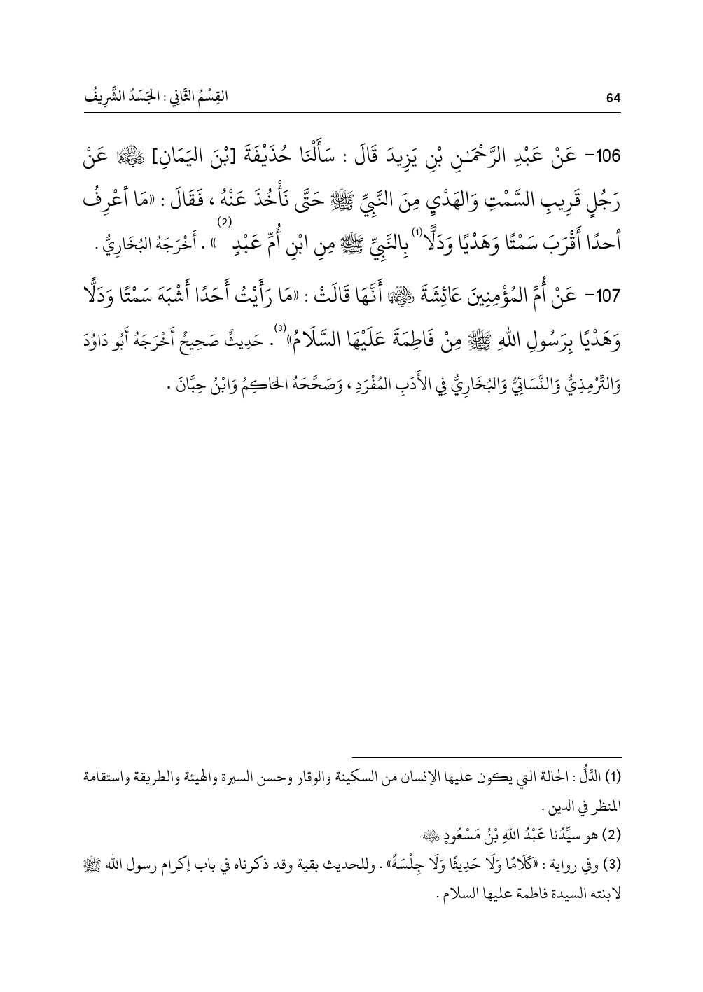 ١٠٧ - عَنْ أُمِّ المُؤْمِنِينَ عَائِشَةَ - رضي الله عنها - أَنَّهَا قَالَتْ: «مَا رَأَيْتُ أَحَدًا أَشْبَهَ سَمْتًا وَدَلًّا وَهَدْيًا بِرَسُولِ اللهِ - صلى الله عليه وسلم - مِنْ فَاطِمَةَ عَلَيْهَا السَّلَامُ» (¬٣). حَدِيثٌ صَحِيحٌ أَخْرَجَهُ أَبُو دَاوُدَ وَالتِّرْمِذِيُّ وَالنَّسَائِيُّ وَالبُخَارِيُّ فِي الأَدَبِ المُفْرَدِ، وَصَحَّحَهُ الحَاكِمُ وَابْنُ حِبَّانَ.