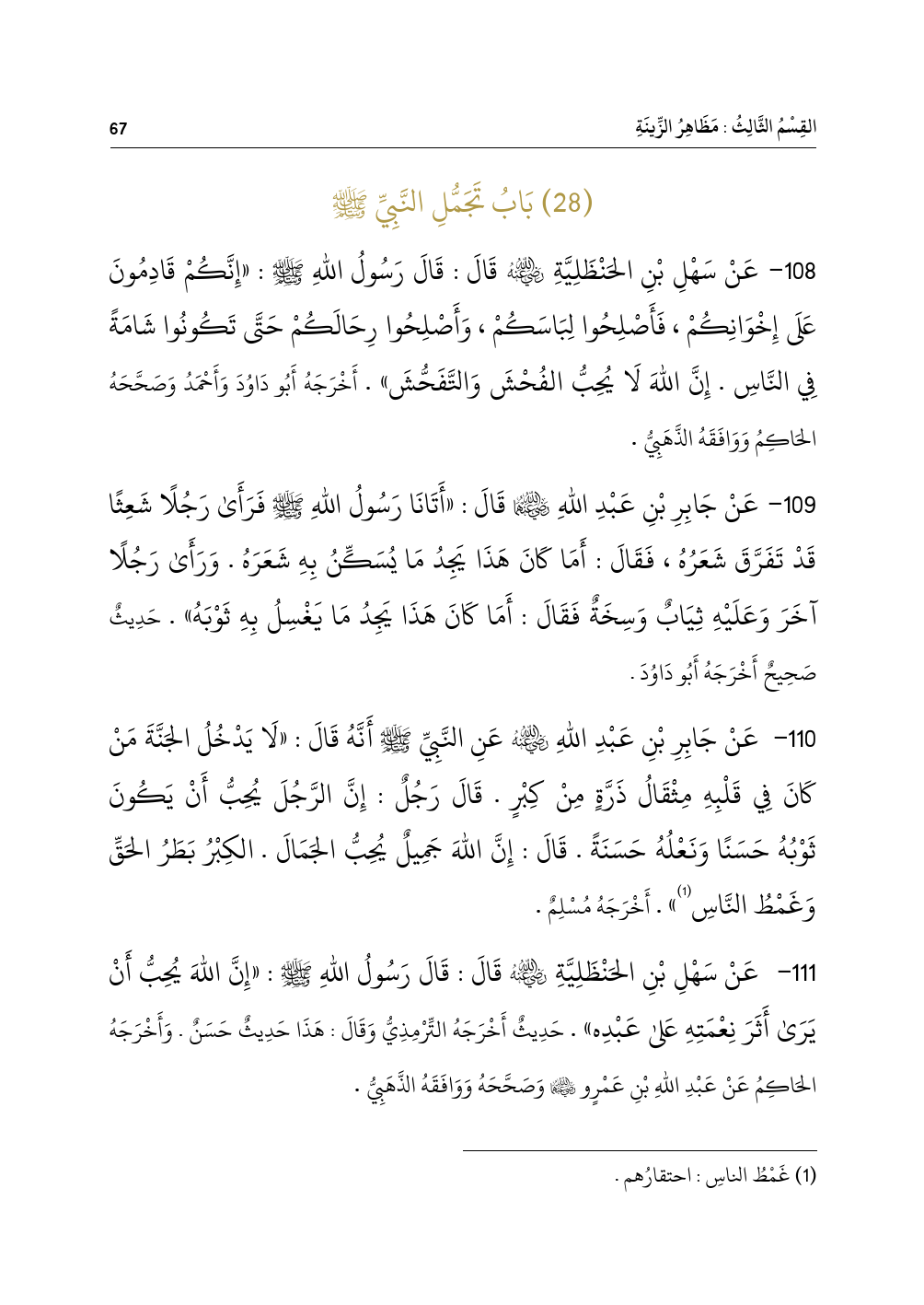 ١٠٨ - عَنْ سَهْلِ بْنِ الحَنْظَلِيَّةِ - رضي الله عنه - قَالَ: قَالَ رَسُولُ اللهِ - صلى الله عليه وسلم -: «إِنَّكُمْ قَادِمُونَ عَلَى إِخْوَانِكُمْ، فَأَصْلِحُوا لِبَاسَكُمْ، وَأَصْلِحُوا رِحَالَكُمْ حَتَّى تَكُونُوا شَامَةً فِي النَّاسِ. إِنَّ اللهَ لَا يُحِبُّ الفُحْشَ وَالتَّفَحُّشَ». أَخْرَجَهُ أَبُو دَاوُدَ وَأَحْمَدُ وَصَحَّحَهُ الحَاكِمُ وَوَافَقَهُ الذَّهَبِيُّ.