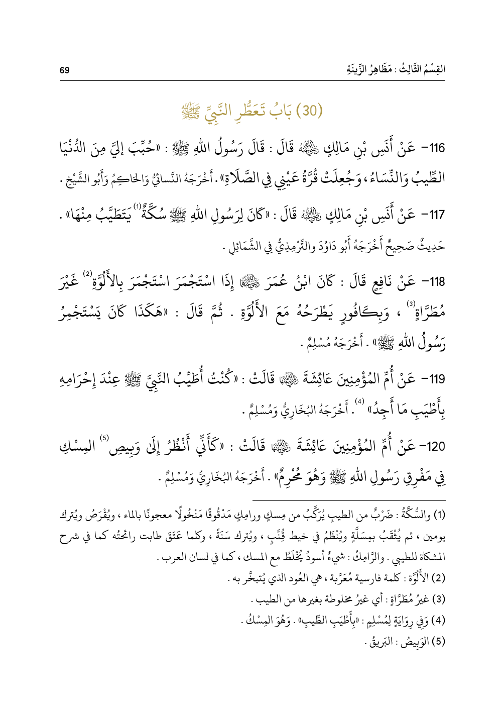 ١١٧ - عَنْ أَنَسِ بْنِ مَالِكٍ - رضي الله عنه - قَالَ: «كَانَ لِرَسُولِ اللهِ - صلى الله عليه وسلم - سُكَّةٌ (¬١) يَتَطَيَّبُ مِنْهَا». حَدِيثٌ صَحِيحٌ أَخْرَجَهُ أَبُو دَاوُدَ والتِّرْمِذِيُّ فِي الشَّمَائِلِ.