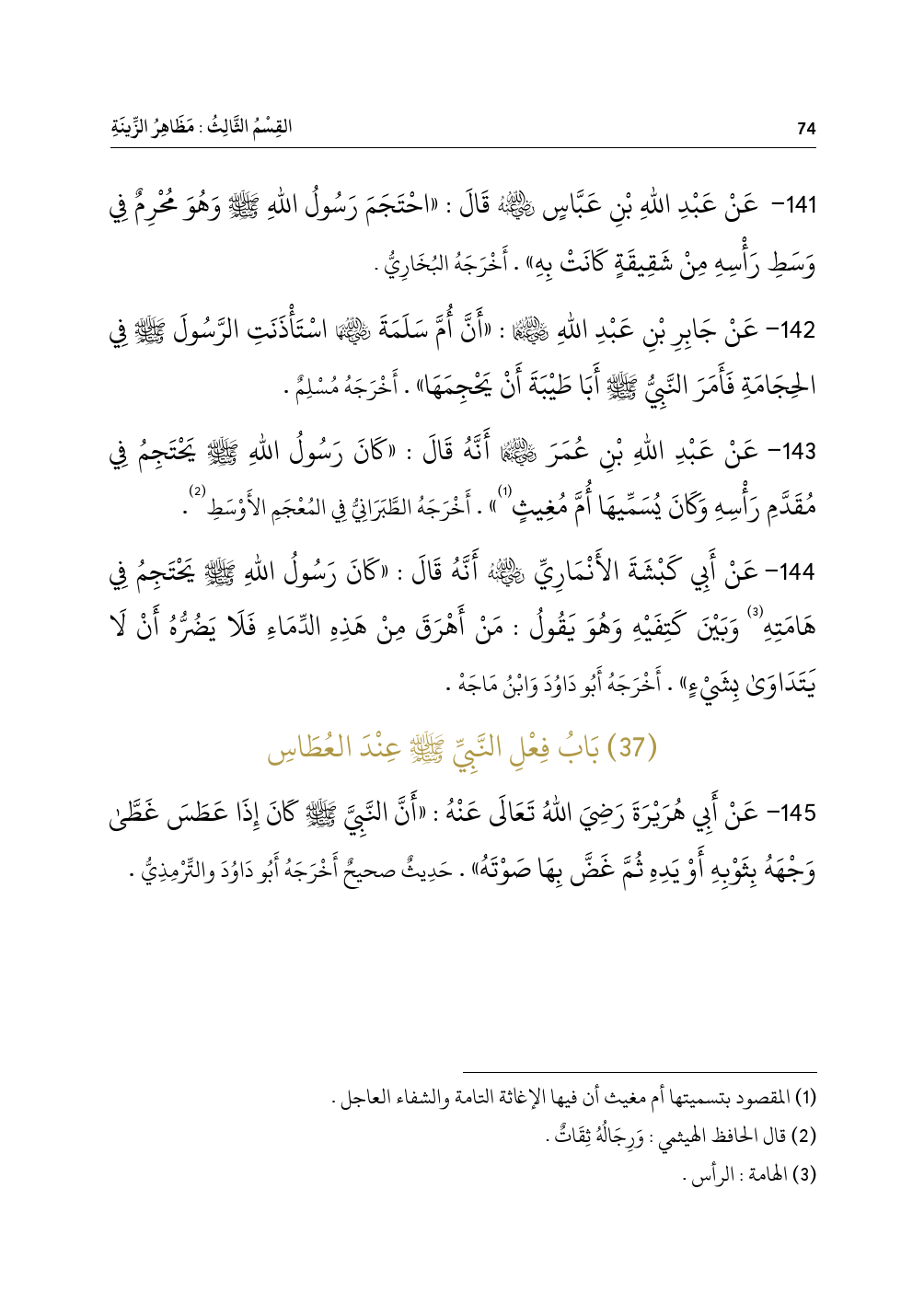 ١٤٣ - عَنْ عَبْدِ اللهِ بْنِ عُمَرَ - رضي الله عنهما - أَنَّهُ قَالَ: «كَانَ رَسُولُ اللهِ - صلى الله عليه وسلم - يَحْتَجِمُ فِي مُقَدَّمِ رَأْسِهِ وَكَانَ يُسَمِّيهَا أُمَّ مُغِيثٍ (¬١)». أَخْرَجَهُ الطَّبَرَانِيُّ فِي المُعْجَمِ الأَوْسَطِ (¬٢).