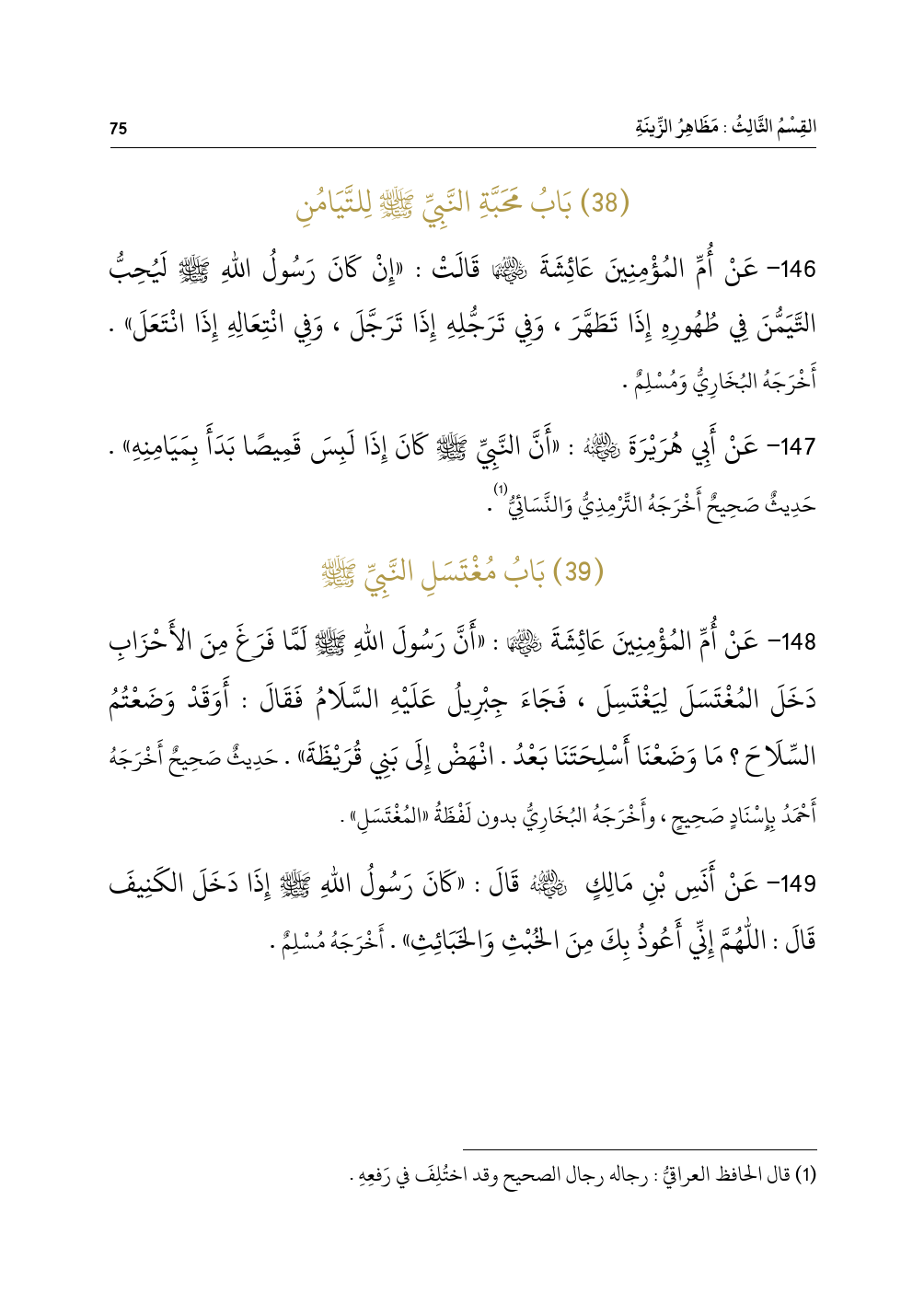 ١٤٦ - عَنْ أُمِّ المُؤْمِنِينَ عَائِشَةَ - رضي الله عنها - قَالَتْ: «إِنْ كَانَ رَسُولُ اللهِ - صلى الله عليه وسلم - لَيُحِبُّ التَّيَمُّنَ فِي طُهُورِهِ إِذَا تَطَهَّرَ، وَفِي تَرَجُّلِهِ إِذَا تَرَجَّلَ، وَفِي انْتِعَالِهِ إِذَا انْتَعَلَ». أَخْرَجَهُ البُخَارِيُّ وَمُسْلِمٌ.