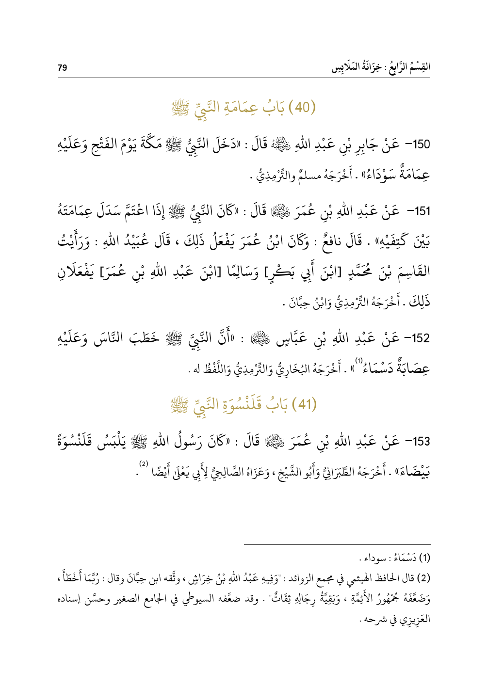 ١٥٣ - عَنْ عَبْدِ اللهِ بْنِ عُمَرَ - رضي الله عنهما - قَالَ: «كَانَ رَسُولُ اللهِ - صلى الله عليه وسلم - يَلْبَسُ قَلَنْسُوَةً بَيْضَاءَ». أَخْرَجَهُ الطَّبَرَانِيُّ وَأَبُو الشَّيْخِ، وَعَزَاهُ الصَّالِحِيُّ لِأَبِي يَعْلَى أَيْضًا (¬٢).