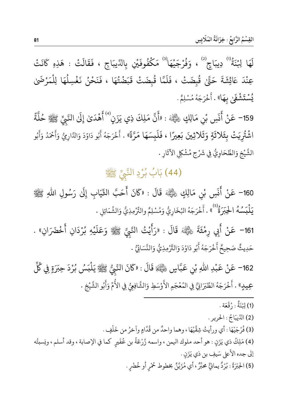 ١٦٠ - عَنْ أَنَسِ بْنِ مَالِكٍ - رضي الله عنه - قَالَ: «كَانَ أَحَبَّ الثِّيَابِ إِلَى رَسُولِ اللهِ - صلى الله عليه وسلم - يَلْبَسُهُ الحِبَرَةُ (¬٥)». أَخْرَجَهُ البُخَارِيُّ وَمُسْلِمٌ والتِّرْمِذِيُّ وَالشَّمَائِلِ.