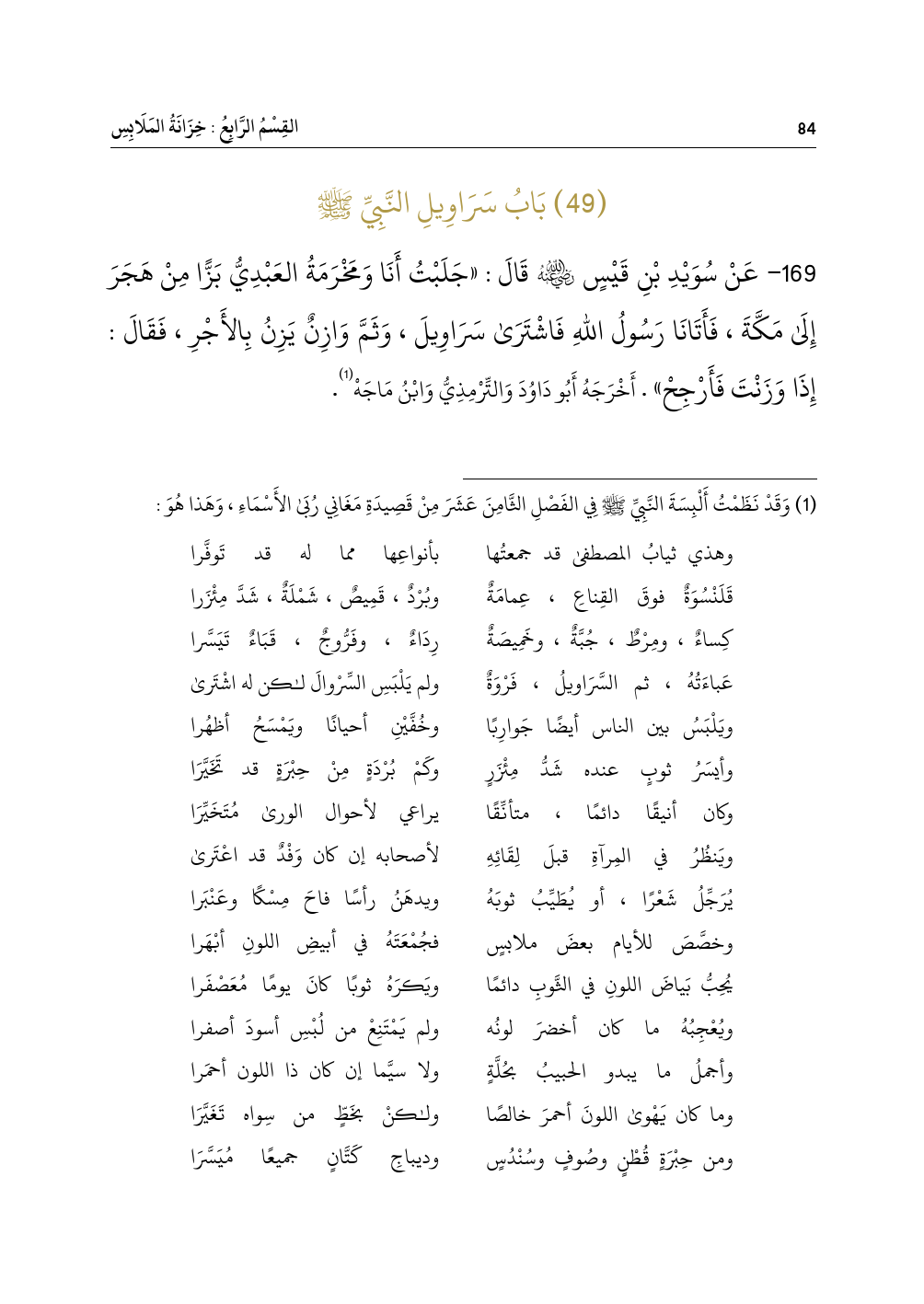 (¬١) وَقَدْ نَظَمْتُ أَلْبِسَةَ النَّبِيِّ - صلى الله عليه وسلم - فِي الفَصْلِ الثَّامِنَ عَشَرَ مِنْ قَصِيدَةِ مَغَانِي رُبَى الأَسْمَاءِ، وَهَذا هُوَ: