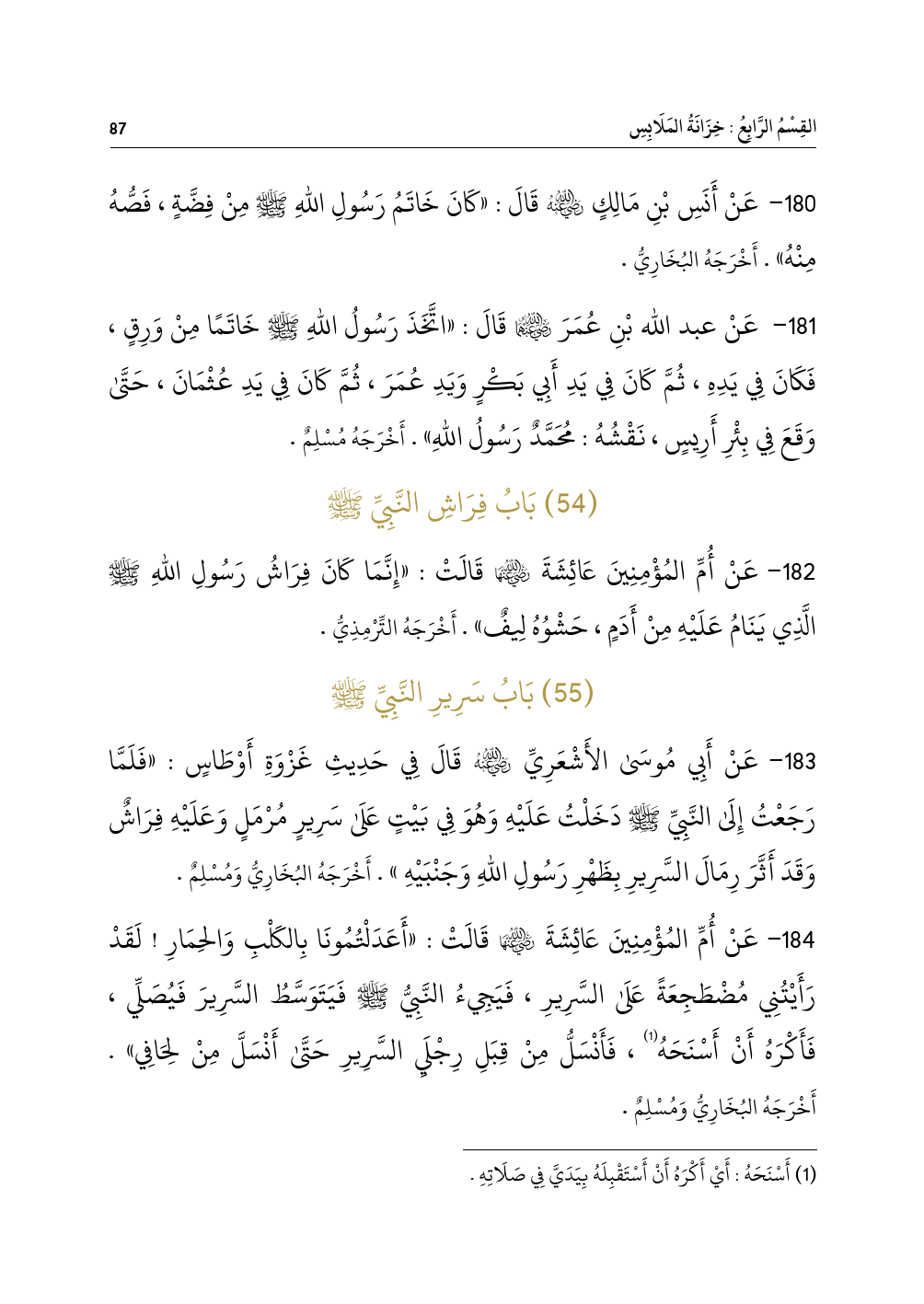 ١٨١ - عَنْ عبد الله بْنِ عُمَرَ - رضي الله عنهما - قَالَ: «اتَّخَذَ رَسُولُ اللهِ - صلى الله عليه وسلم - خَاتَمًا مِنْ وَرِقٍ، فَكَانَ فِي يَدِهِ، ثُمَّ كَانَ فِي يَدِ أَبِي بَكْرٍ وَيَدِ عُمَرَ، ثُمَّ كَانَ فِي يَدِ عُثْمَانَ، حَتَّى وَقَعَ فِي بِئْرِ أَرِيسٍ، نَقْشُهُ: مُحَمَّدٌ رَسُولُ اللهِ». أَخْرَجَهُ مُسْلِمٌ.