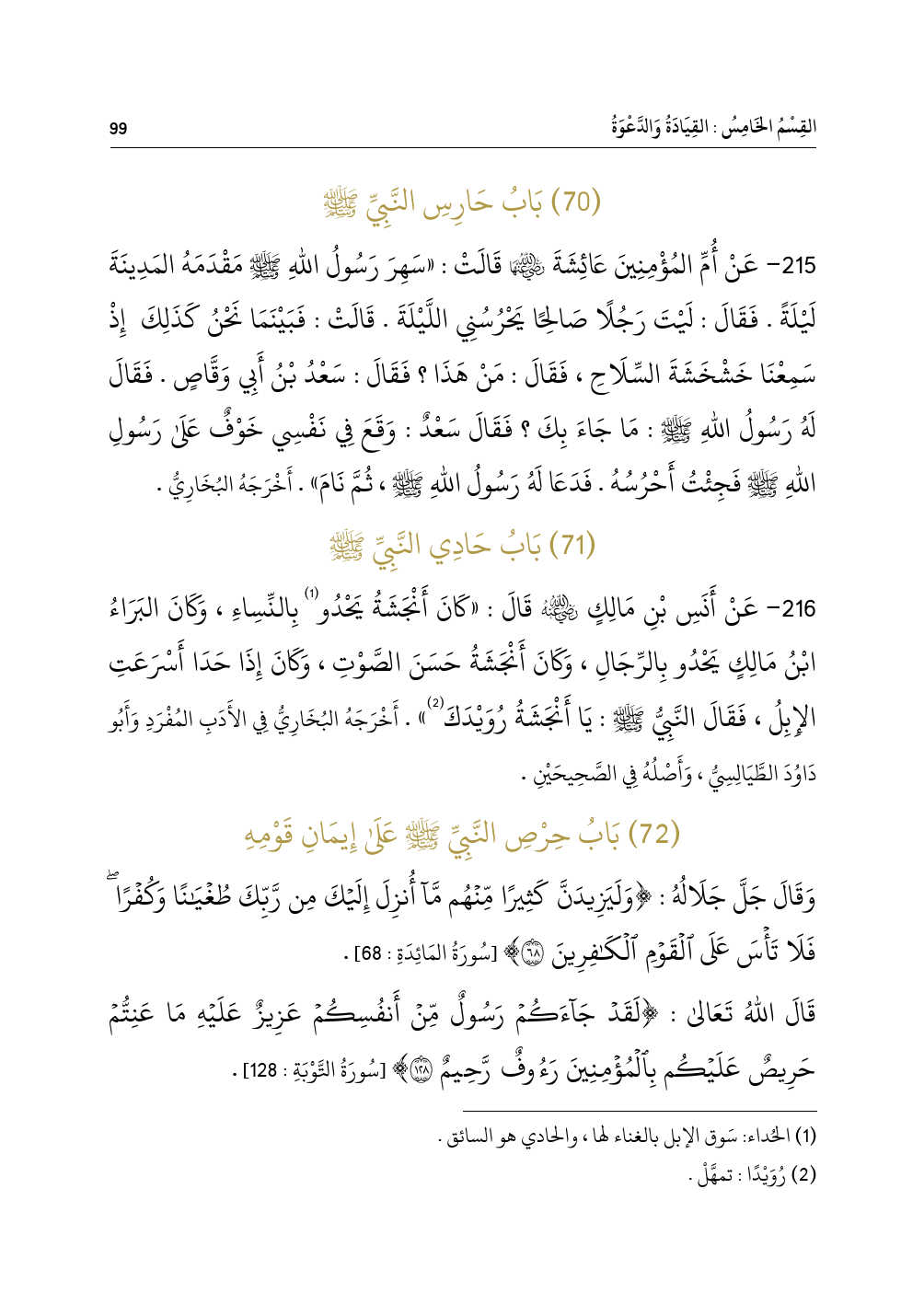 ٢١٥ - عَنْ أُمِّ المُؤْمِنِينَ عَائِشَةَ - رضي الله عنها - قَالَتْ: «سَهِرَ رَسُولُ اللهِ - صلى الله عليه وسلم - مَقْدَمَهُ المَدِينَةَ لَيْلَةً. فَقَالَ: لَيْتَ رَجُلًا صَالِحًا يَحْرُسُنِي اللَّيْلَةَ. قَالَتْ: فَبَيْنَمَا نَحْنُ كَذَلِكَ إِذْ سَمِعْنَا خَشْخَشَةَ السِّلَاحِ، فَقَالَ: مَنْ هَذَا؟ فَقَالَ: سَعْدُ بْنُ أَبِي وَقَّاصٍ. فَقَالَ لَهُ رَسُولُ اللهِ - صلى الله عليه وسلم -: مَا جَاءَ بِكَ؟ فَقَالَ سَعْدٌ: وَقَعَ فِي نَفْسِي خَوْفٌ عَلَى رَسُولِ اللهِ - صلى الله عليه وسلم - فَجِئْتُ أَحْرُسُهُ. فَدَعَا لَهُ رَسُولُ اللهِ - صلى الله عليه وسلم -، ثُمَّ نَامَ». أَخْرَجَهُ البُخَارِيُّ.