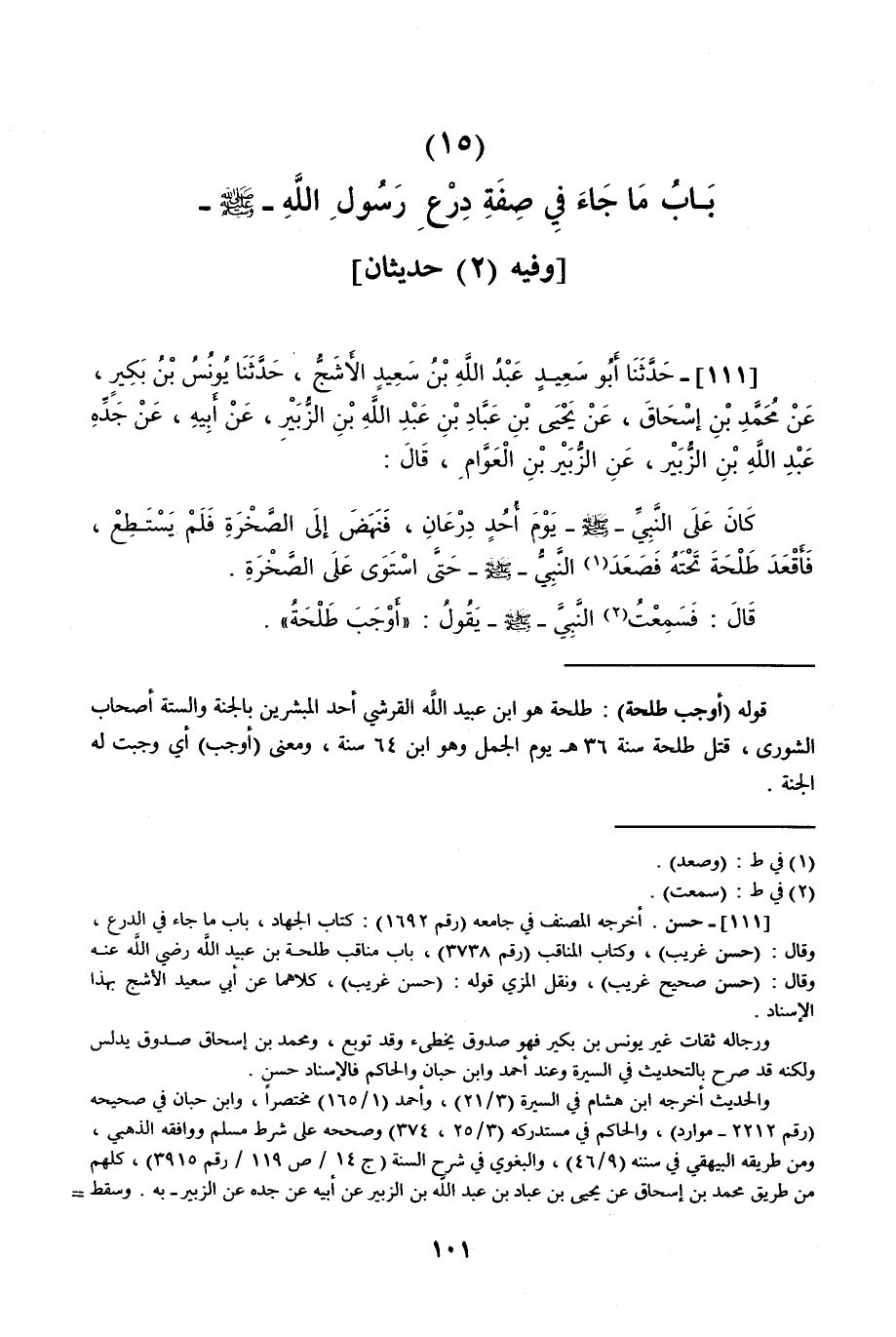 111 - حَدَّثَنَا أَبُو سَعِيدٍ عَبْدُ اللَّهِ بْنُ سَعِيدٍ الْأَشَجُّ قَالَ: حَدَّثَنَا يُونُسُ بْنُ بُكَيْرٍ، عَنْ مُحَمَّدِ بْنِ إِسْحَاقَ، عَنْ يَحْيَى بْنِ عَبَّادِ بْنِ عَبْدِ اللَّهِ بْنِ الزُّبَيْرِ، عَنْ أَبِيهِ، عَنْ جَدِّهِ عَبْدِ اللَّهِ بْنِ الزُّبَيْرِ، عَنِ الزُّبَيْرِ بْنِ الْعَوَّامِ قَالَ: كَانَ عَلَى النَّبِيِّ صَلَّى اللهُ عَلَيْهِ وَسَلَّمَ يَوْمَ أُحُدٍ دِرْعَانِ، §فَنَهَضَ إِلَى الصَّخْرَةِ فَلَمْ يَسْتَطِعْ، فَأَقْعَدَ طَلْحَةَ تَحْتَهُ، وَصَعِدَ النَّبِيُّ صَلَّى اللهُ عَلَيْهِ وَسَلَّمَ حَتَّى اسْتَوَى عَلَى الصَّخْرَةِ قَالَ: سَمِعْتُ النَّبِيَّ صَلَّى اللهُ عَلَيْهِ وَسَلَّمَ يَقُولُ: «أَوْجَبَ طَلْحَةُ»