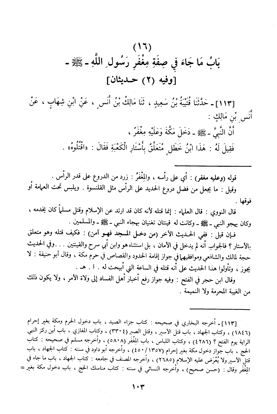 113 - حَدَّثَنَا قُتَيْبَةُ بْنُ سَعِيدٍ قَالَ: حَدَّثَنَا مَالِكُ بْنُ أَنَسٍ، عَنِ ابْنِ شِهَابٍ، عَنْ أَنَسِ بْنِ مَالِكٍ: أَنَّ النَّبِيَّ صَلَّى اللهُ عَلَيْهِ وَسَلَّمَ §دَخَلَ مَكَّةَ وَعَلَيْهِ مِغْفَرٌ، فَقِيلَ لَهُ: هَذَا ابْنُ خَطَلٍ مُتَعَلِّقٌ بِأَسْتَارِ الْكَعْبَةِ، فَقَالَ: «اقْتُلُوهُ»