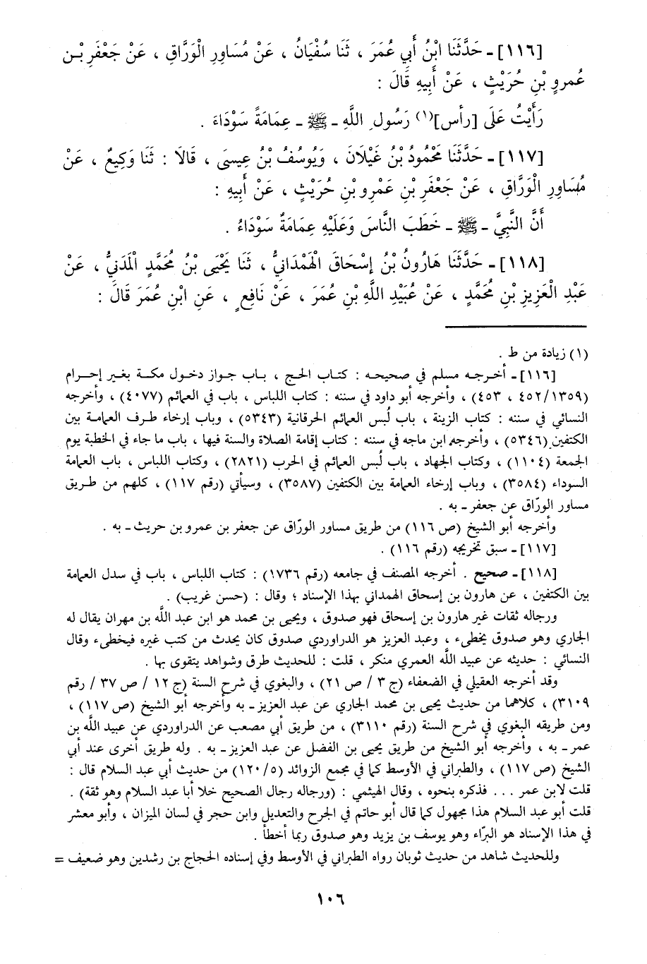 116 - حَدَّثَنَا ابْنُ أَبِي عُمَرَ قَالَ: حَدَّثَنَا سُفْيَانُ، عَنْ مُسَاوِرٍ الْوَرَّاقِ، عَنْ جَعْفَرِ بْنِ عَمْرِو بْنِ حُرَيْثٍ، عَنْ أَبِيهِ قَالَ: «§رَأَيْتُ النَّبِيَّ صَلَّى اللهُ عَلَيْهِ وَسَلَّمَ يَخْطُبُ عَلَى الْمِنْبَرِ وَعَلَيْهِ عِمَامَةٌ سَوْدَاءُ»