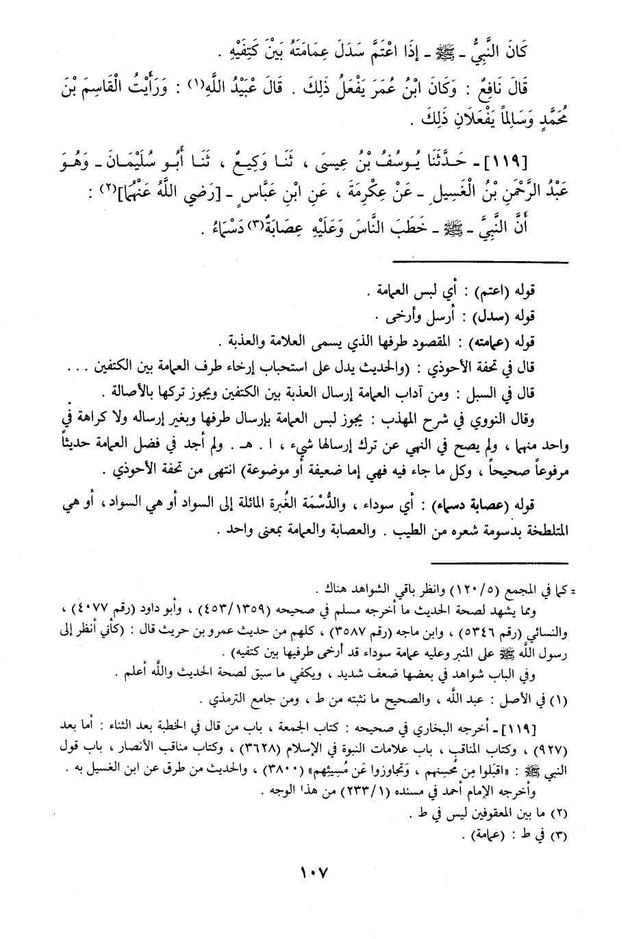119 - حَدَّثَنَا يُوسُفُ بْنُ عِيسَى قَالَ: حَدَّثَنَا وَكِيعٌ قَالَ: حَدَّثَنَا أَبُو سُلَيْمَانَ وَهُوَ عَبْدُ الرَّحْمَنِ بْنُ الْغَسِيلِ، عَنْ عِكْرِمَةَ، عَنِ ابْنِ عَبَّاسٍ: «أَنَّ النَّبِيَّ صَلَّى اللهُ عَلَيْهِ وَسَلَّمَ §خَطَبَ النَّاسَ وَعَلَيْهِ عِصَابَةٌ دَسْمَاءُ»