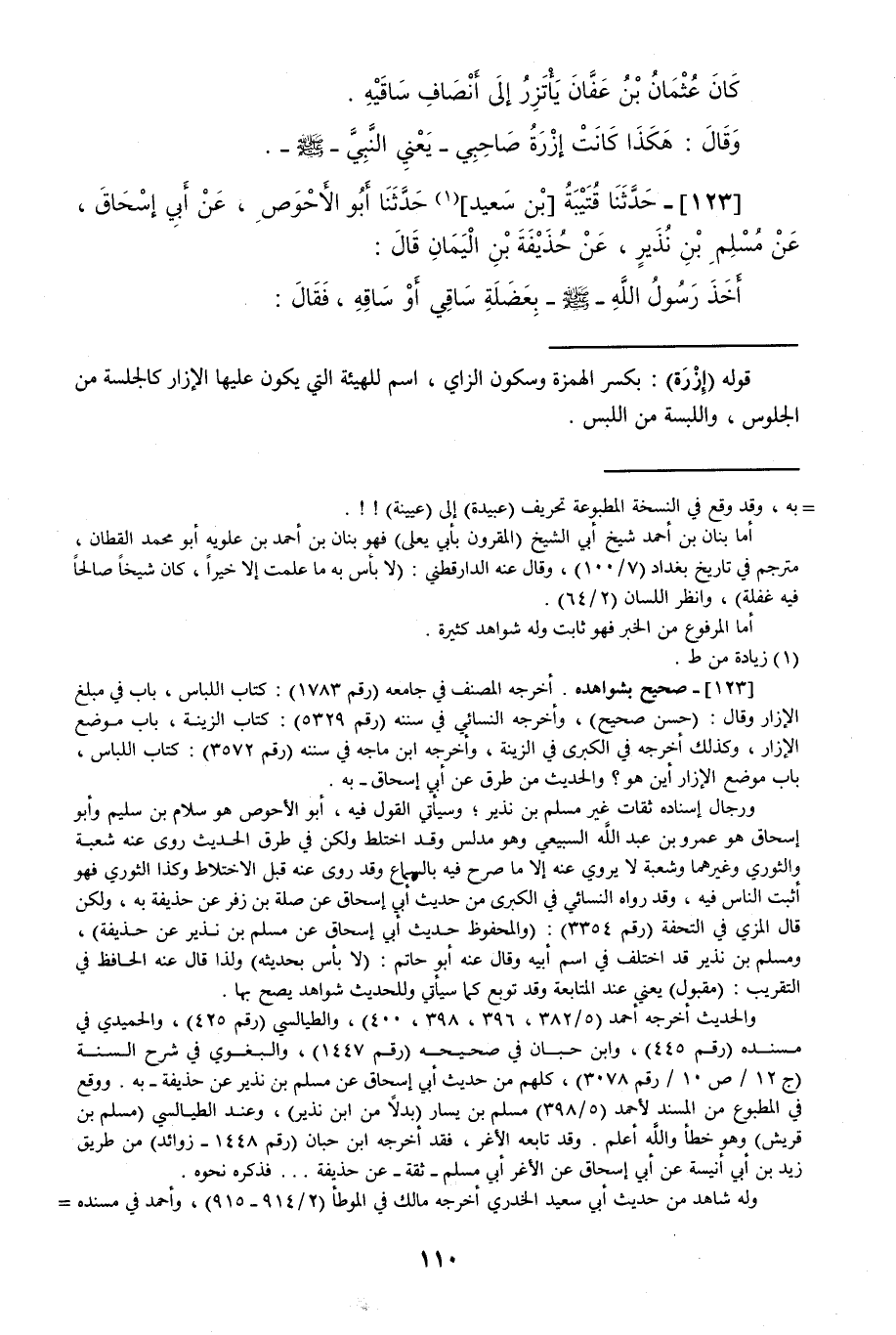 123 - حَدَّثَنَا قُتَيْبَةُ بْنُ سَعِيدٍ قَالَ: حَدَّثَنَا أَبُو الْأَحْوَصِ، عَنْ أَبِي إِسْحَاقَ، عَنْ مُسْلِمِ بْنِ نَذِيرٍ، عَنْ حُذَيْفَةَ بْنِ الْيَمَانِ قَالَ: أَخَذَ رَسُولُ اللَّهِ صَلَّى اللهُ عَلَيْهِ وَسَلَّمَ بِعَضَلَةِ سَاقِي أَوْ سَاقِهِ فَقَالَ -[111]-: «§هَذَا مَوْضِعُ الْإِزَارِ، فَإِنْ أَبَيْتَ فَأَسْفَلَ، فَإِنْ أَبَيْتَ فَلَا حَقَّ لِلْإِزَارِ فِي الْكَعْبَيْنِ»