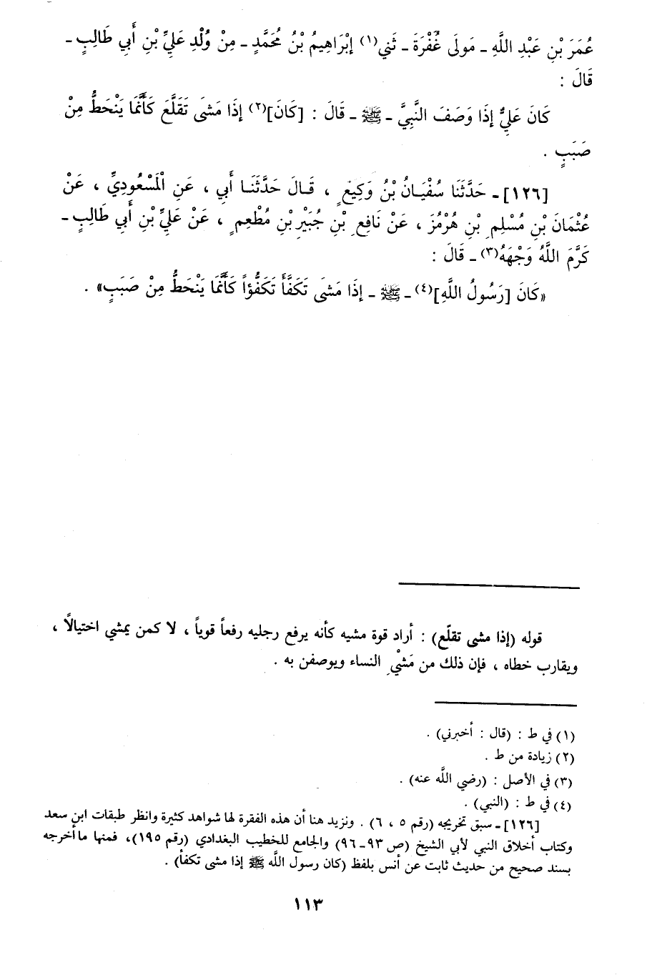 126 - حَدَّثَنَا سُفْيَانُ بْنُ وَكِيعٍ قَالَ: حَدَّثَنَا أَبِي، عَنِ الْمَسْعُودِيِّ، عَنْ عُثْمَانَ بْنِ مُسْلِمِ بْنِ هُرْمُزَ، عَنْ نَافِعِ بْنِ جُبَيْرِ بْنِ مُطْعِمٍ، عَنْ عَلِيِّ بْنِ أَبِي طَالِبٍ قَالَ: «كَانَ النَّبِيُّ صَلَّى اللهُ عَلَيْهِ وَسَلَّمَ §إِذَا مَشَى تَكَفَّأَ تَكَفُّؤًا كَأَنَّمَا يَنْحَطُّ مِنْ صَبَبٍ»