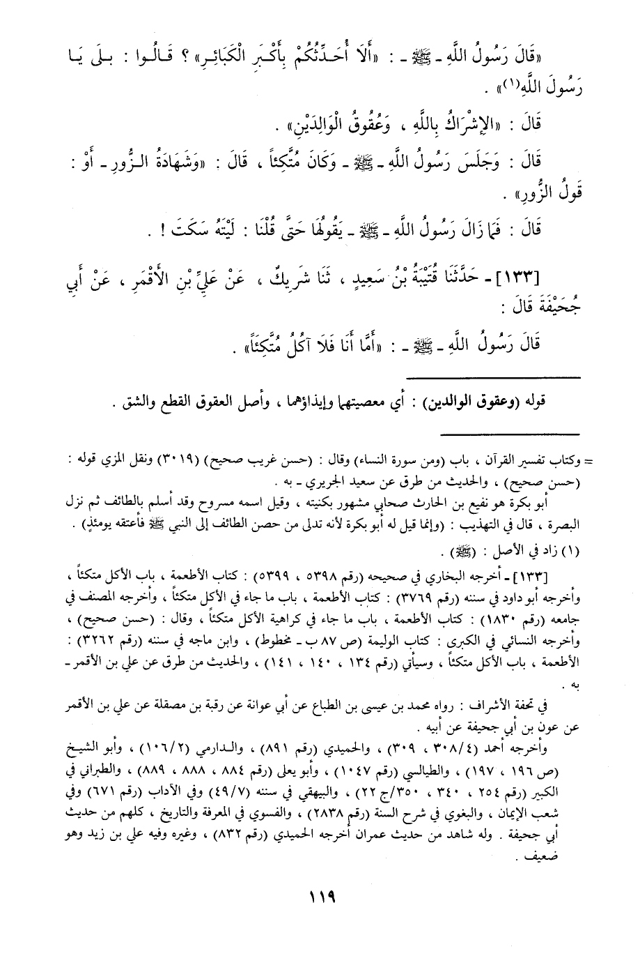 133 - حَدَّثَنَا قُتَيْبَةُ بْنُ سَعِيدٍ قَالَ: حَدَّثَنَا شَرِيكٌ، عَنْ عَلِيِّ بْنِ الْأَقْمَرِ، عَنْ أَبِي جُحَيْفَةَ قَالَ: قَالَ رَسُولُ اللَّهِ صَلَّى اللهُ عَلَيْهِ وَسَلَّمَ: «§أَمَّا أَنَا فَلَا آكُلُ مُتَّكِئًا»