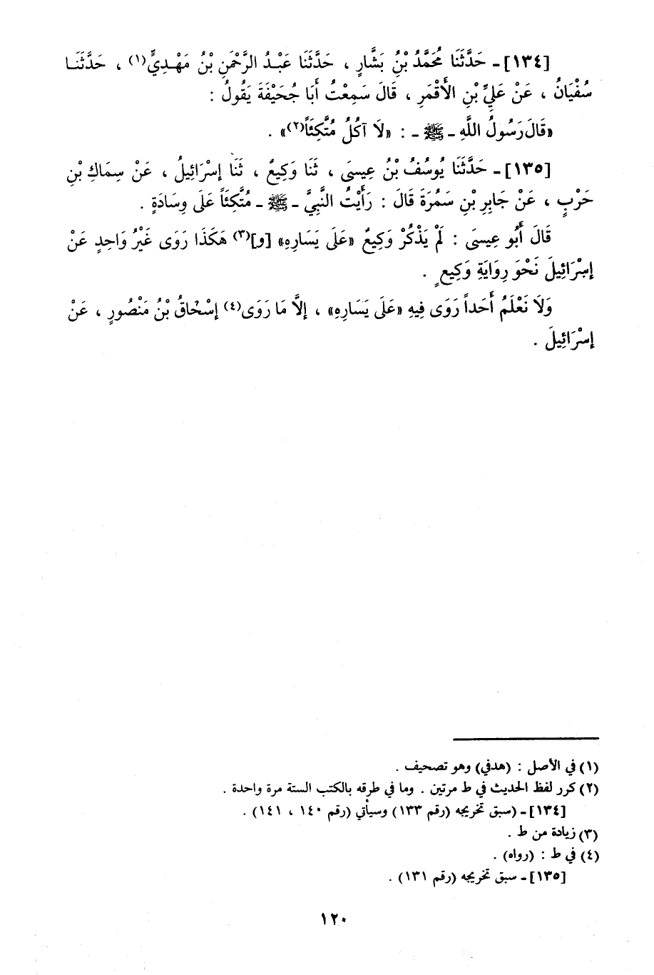 134 - حَدَّثَنَا مُحَمَّدُ بْنُ بَشَّارٍ قَالَ: حَدَّثَنَا عَبْدُ الرَّحْمَنِ بْنُ مَهْدِيٍّ قَالَ: حَدَّثَنَا سُفْيَانُ، عَنْ عَلِيِّ بْنِ الْأَقْمَرِ قَالَ: سَمِعْتُ أَبَا جُحَيْفَةَ يَقُولُ: قَالَ رَسُولُ اللَّهِ صَلَّى اللهُ عَلَيْهِ وَسَلَّمَ: «§لَا آكُلُ مُتَّكِئًا»