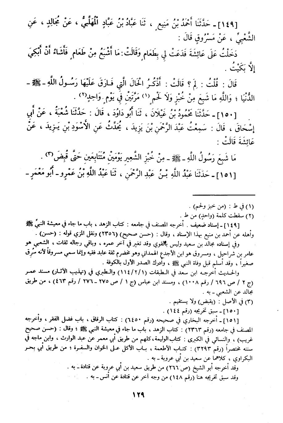 149 - حَدَّثَنَا أَحْمَدُ بْنُ مَنِيعٍ قَالَ: حَدَّثَنَا عَبَّادُ بْنُ عَبَّادٍ الْمُهَلَّبِيُّ، عَنْ مُجَالِدٍ، عَنِ الشَّعْبِيِّ، عَنْ مَسْرُوقٍ قَالَ: دَخَلْتُ عَلَى عَائِشَةَ، فَدَعَتْ لِي بِطَعَامٍ وَقَالَتْ: «مَا أَشْبَعُ مِنْ طَعَامٍ فَأَشَاءُ أَنْ أَبْكِيَ إِلَّا بَكِيتُ» . قَالَ: قُلْتُ لِمَ؟ قَالَتْ: «§أَذْكُرُ الْحَالَ الَّتِي فَارَقَ عَلَيْهَا رَسُولُ اللَّهِ صَلَّى اللهُ عَلَيْهِ وَسَلَّمَ الدُّنْيَا، وَاللَّهِ مَا شَبِعَ مِنْ خُبْزٍ وَلَحْمٍ مَرَّتَيْنِ فِي يَوْمٍ»