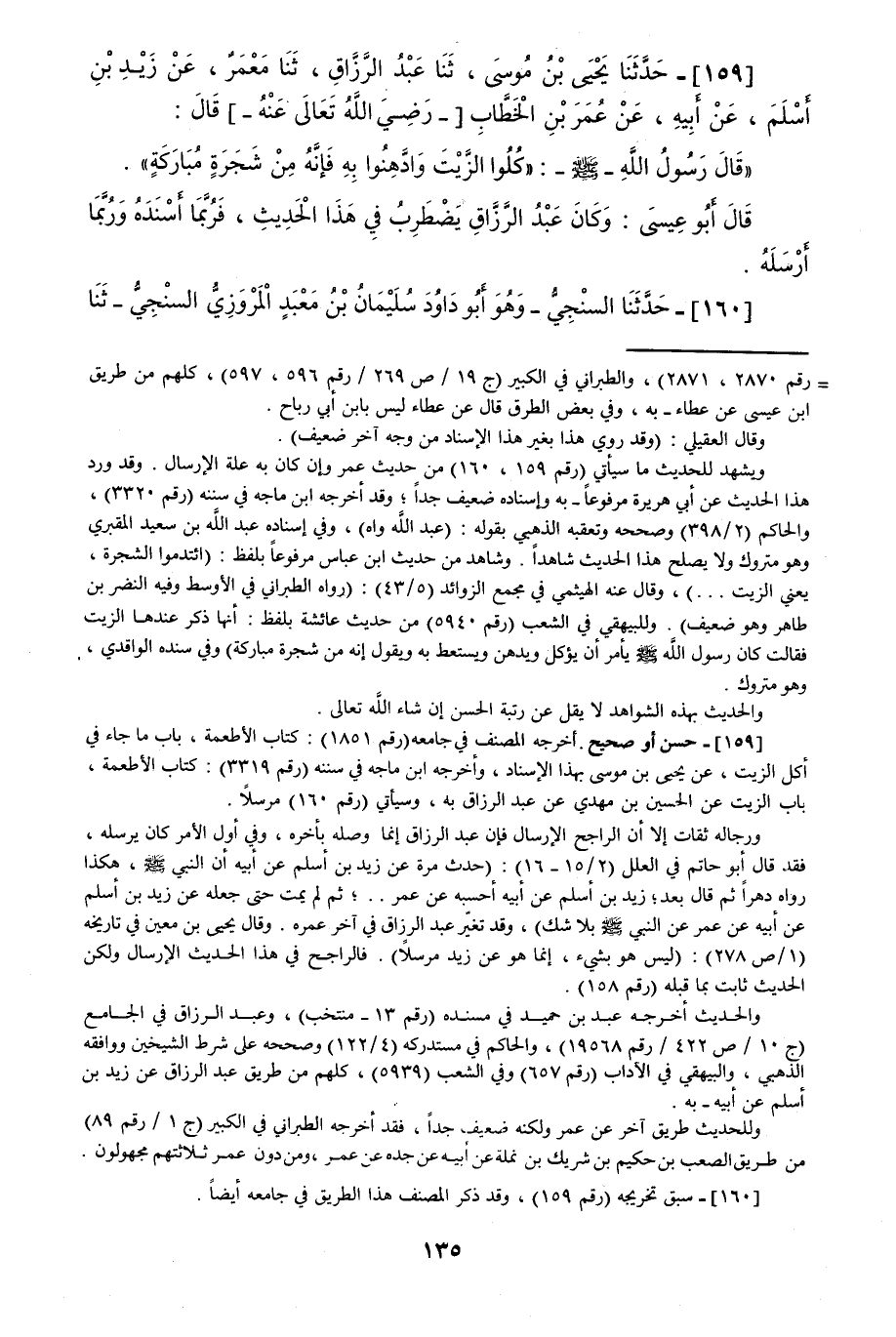 159 - حَدَّثَنَا يَحْيَى بْنُ مُوسَى قَالَ: حَدَّثَنَا عَبْدُ الرَّزَّاقِ قَالَ: حَدَّثَنَا مَعْمَرٌ، عَنْ زَيْدِ بْنِ أَسْلَمَ، عَنْ أَبِيهِ، عَنْ عُمَرَ بْنِ الْخَطَّابِ قَالَ: قَالَ رَسُولُ اللَّهِ صَلَّى اللهُ عَلَيْهِ وَسَلَّمَ: «§كُلُوا الزَّيْتَ وَادَّهِنُوا بِهِ؛ فَإِنَّهُ مِنْ شَجَرَةٍ مُبَارَكَةٍ» قَالَ أَبُو عِيسَى: «وَعَبْدُ الرَّزَّاقِ كَانَ يَضْطَرِبُ فِي هَذَا الْحَدِيثِ فَرُبَّمَا أَسْنَدَهُ، وَرُبَّمَا أَرْسَلَهُ»