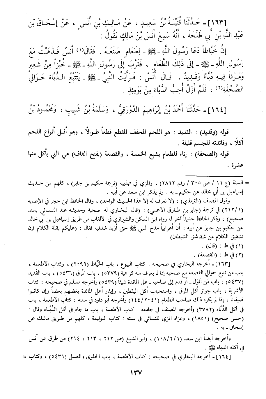 163 - حَدَّثَنَا قُتَيْبَةُ بْنُ سَعِيدٍ، عَنْ مَالِكِ بْنِ أَنَسٍ، عَنِ إِسْحَاقَ بْنِ عَبْدِ اللَّهِ بْنِ أَبِي طَلْحَةَ، أَنَّهُ سَمِعَ أَنَسَ بْنَ مَالِكٍ يَقُولُ: إِنَّ خَيَّاطًا دَعَا رَسُولَ اللَّهِ صَلَّى اللهُ عَلَيْهِ وَسَلَّمَ لِطَعَامٍ صَنَعَهُ، قَالَ أَنَسٌ: فَذَهَبْتُ مَعَ رَسُولِ اللَّهِ صَلَّى اللهُ عَلَيْهِ وَسَلَّمَ إِلَى ذَلِكَ الطَّعَامِ فَقَرَّبَ إِلَى رَسُولِ اللَّهِ صَلَّى اللهُ عَلَيْهِ وَسَلَّمَ خُبْزًا مِنْ شَعِيرٍ، وَمَرَقًا فِيهِ دُبَّاءٌ وَقَدِيدٌ، قَالَ أَنَسُ: «فَرَأَيْتُ النَّبِيَّ صَلَّى اللهُ عَلَيْهِ وَسَلَّمَ §يَتَتَبَّعُ الدُّبَّاءَ حَوَالَيِ الْقَصْعَةِ» فَلَمْ أَزَلْ أُحِبُّ الدُّبَّاءَ مِنْ يَوْمِئِذٍ