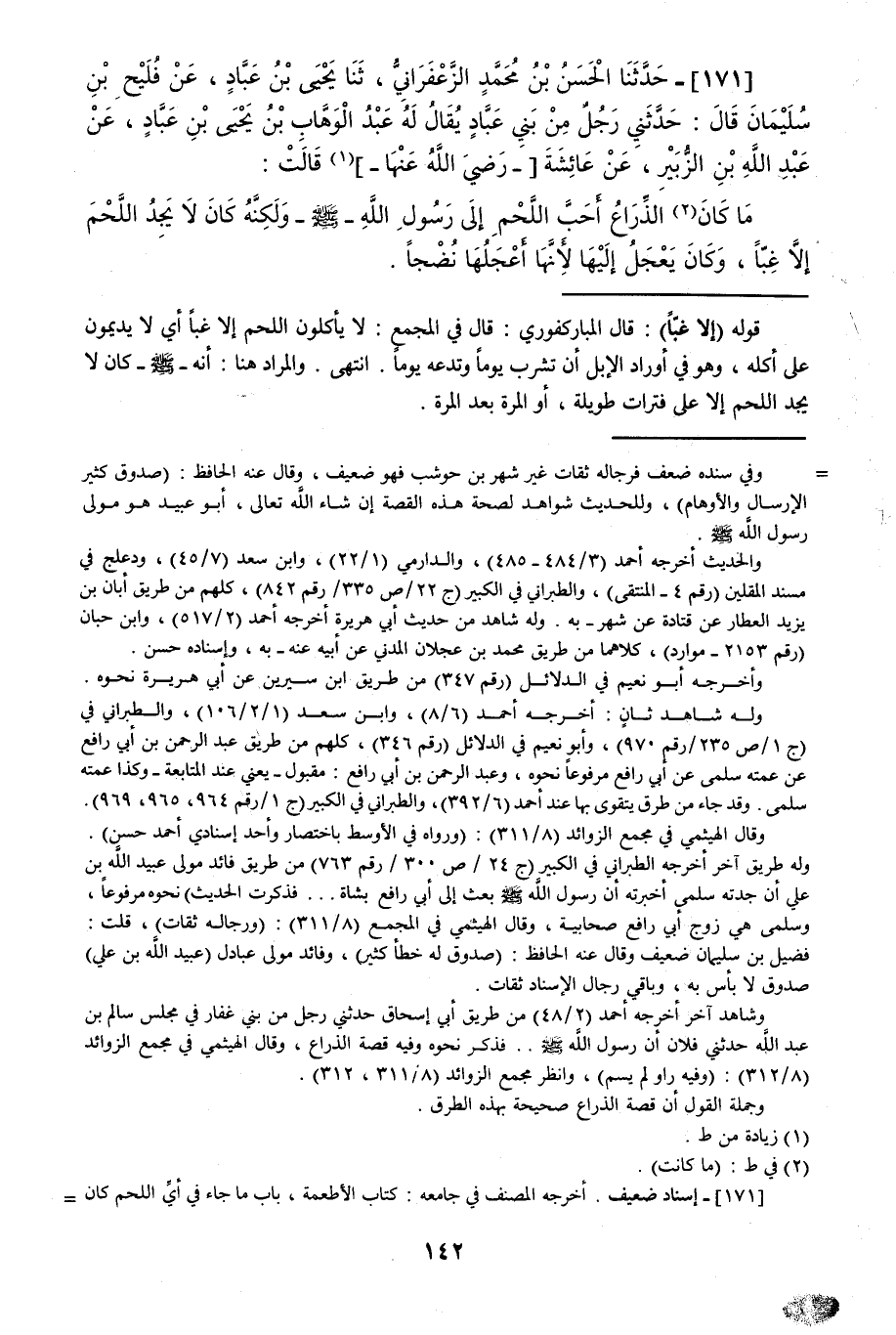 171 - حَدَّثَنَا الْحَسَنُ بْنُ مُحَمَّدٍ الزَّعْفَرَانِيُّ قَالَ: حَدَّثَنَا يَحْيَى بْنُ عَبَّادٍ، عَنْ فُلَيْحِ بْنِ سُلَيْمَانَ قَالَ: حَدَّثَنِي رَجُلٌ، مِنْ بَنِي عَبَّادٍ يُقَالَ لَهُ: عَبْدُ الْوَهَّابِ بْنُ يَحْيَى بْنُ عَبَّادٍ، عَنْ عَبْدِ اللَّهِ بْنِ الزُّبَيْرِ، عَنْ عَائِشَةَ، قَالَتْ: «§مَا كَانَتِ الذِّرَاعُ أَحَبَّ اللَّحْمِ إِلَى رَسُولِ اللَّهِ صَلَّى اللهُ عَلَيْهِ وَسَلَّمَ وَلَكِنَّهُ كَانَ لَا يَجِدُ اللَّحْمَ إِلَّا غِبًّا، وَكَانَ يَعْجَلُ إِلَيْهَا لِأَنَّهَا أَعْجَلُهَا نُضْجًا»