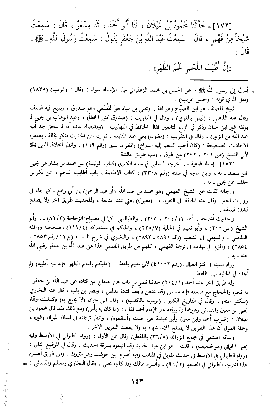 172 - حَدَّثَنَا مَحْمُودُ بْنُ غَيْلَانَ قَالَ: حَدَّثَنَا أَبُو أَحْمَدَ قَالَ: حَدَّثَنَا مِسْعَرٌ قَالَ: سَمِعْتُ شَيْخًا، مِنْ فَهْمٍ قَالَ: سَمِعْتُ عَبْدَ اللَّهِ بْنَ جَعْفَرٍ يَقُولُ: سَمِعْتُ رَسُولَ اللَّهِ صَلَّى اللهُ عَلَيْهِ وَسَلَّمَ يَقُولُ: «إِنَّ §أَطْيَبَ اللَّحْمِ لَحْمُ الظَّهْرِ»