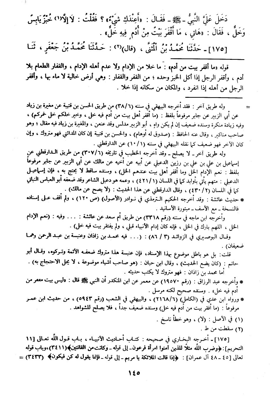 175 - حَدَّثَنَا مُحَمَّدُ بْنُ الْمُثَنَّى قَالَ: حَدَّثَنَا مُحَمَّدُ بْنُ جَعْفَرٍ قَالَ: حَدَّثَنَا -[146]- شُعْبَةُ، عَنْ عَمْرِو بْنِ مُرَّةَ، عَنْ مُرَّةَ الْهَمْدَانِيِّ، عَنْ أَبِي مُوسَى الْأَشْعَرِيِّ، عَنِ النَّبِيِّ صَلَّى اللهُ عَلَيْهِ وَسَلَّمَ قَالَ: «§فَضْلُ عَائِشَةَ عَلَى النِّسَاءِ كَفَضْلِ الثَّرِيدِ عَلَى سَائِرِ الطَّعَامِ»
