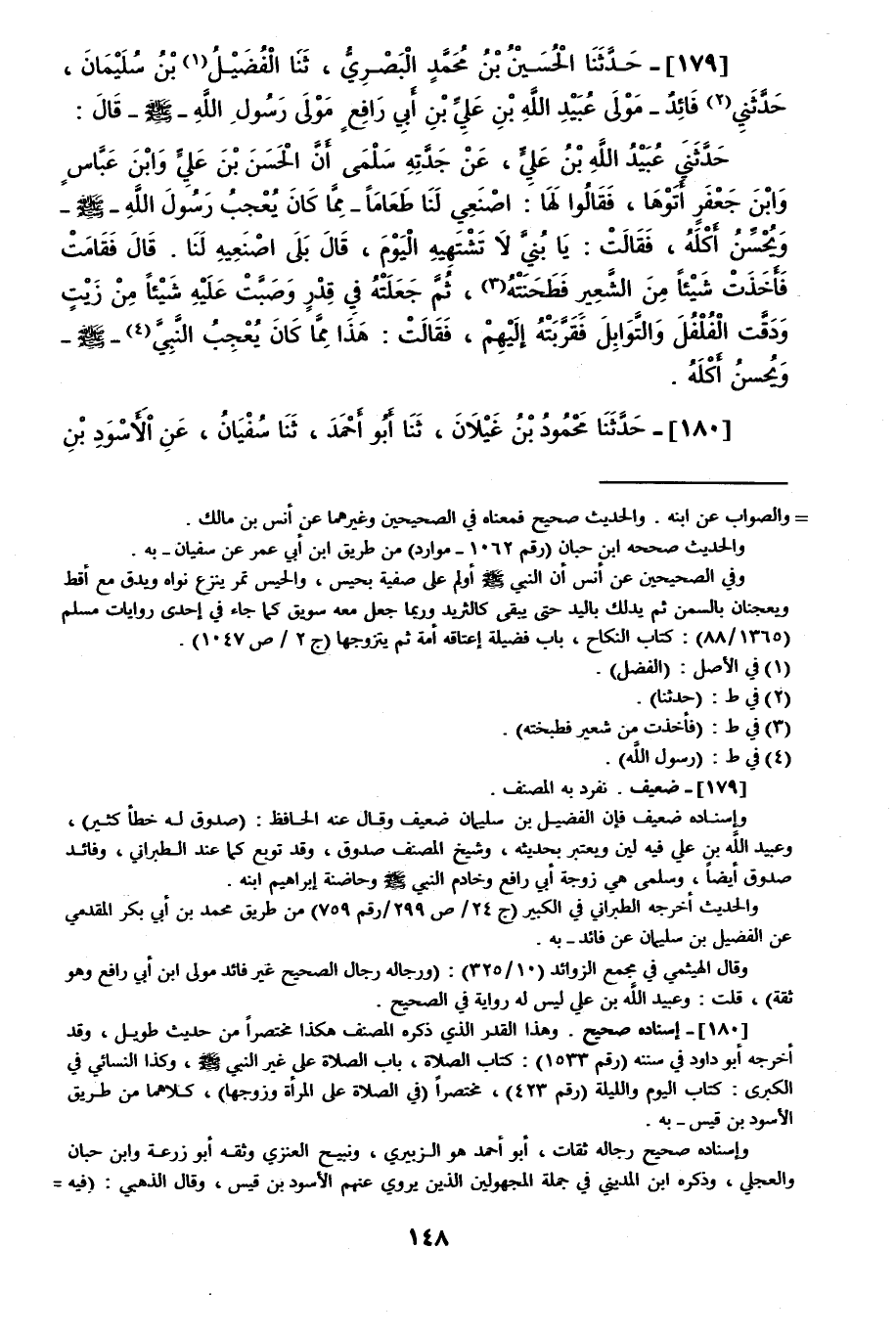 179 - حَدَّثَنَا الْحُسَيْنُ بْنُ مُحَمَّدٍ الْبَصْرِيُّ قَالَ: حَدَّثَنَا الْفُضَيْلُ بْنُ سُلَيْمَانَ قَالَ: حَدَّثَنِي فَائِدٌ، مَوْلَى عُبَيْدِ اللَّهِ بْنِ عَلِيِّ بْنِ أَبِي رَافِعٍ مَوْلَى رَسُولِ اللَّهِ صَلَّى اللهُ عَلَيْهِ وَسَلَّمَ قَالَ: حَدَّثَنِي عُبَيْدُ اللَّهِ بْنُ عَلِيٍّ، عَنْ جَدَّتِهِ سَلْمَى، أَنَّ الْحَسَنَ بْنَ عَلِيٍّ، وَابْنَ عَبَّاسٍ، وَابْنَ جَعْفَرٍ أَتَوْهَا فَقَالُوا لَهَا: اصْنَعِي لَنَا طَعَامًا مِمَّا كَانَ يُعْجِبُ رَسُولَ اللَّهِ صَلَّى اللهُ عَلَيْهِ وَسَلَّمَ وَيُحْسِنُ أَكْلَهُ. فَقَالَتْ: يَا بُنَيَّ لَا تَشْتَهِيهِ الْيَوْمَ قَالَ: بَلَى اصْنَعِيهِ لَنَا. قَالَ: فَقَامَتْ فَأَخَذَتْ مِنْ شَعِيرٍ فَطَحَنَتْهُ، ثُمَّ جَعَلَتْهُ فِي قِدْرٍ، وَصَبَّتْ عَلَيْهِ شَيْئًا مِنْ زَيْتٍ وَدَقَّتِ الْفُلْفُلَ وَالتَّوَابِلَ فَقَرَّبَتْهُ إِلَيْهِمْ، فَقَالَتْ: «§هَذَا مِمَّا كَانَ يُعْجِبُ رَسُولَ اللَّهِ صَلَّى اللهُ عَلَيْهِ وَسَلَّمَ وَيُحْسِنُ أَكْلَهُ»