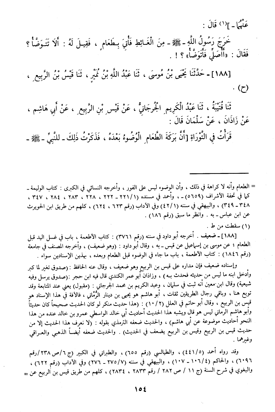 188 - حَدَّثَنَا يَحْيَى بْنُ مُوسَى قَالَ: حَدَّثَنَا عَبْدُ اللَّهِ بْنُ نُمَيْرٍ قَالَ: حَدَّثَنَا قَيْسُ بْنُ الرَّبِيعِ، (ح) وَحَدَّثَنَا قُتَيْبَةُ قَالَ: حَدَّثَنَا عَبْدُ الْكَرِيمِ الْجُرْجَانِيُّ، عَنْ قَيْسِ بْنِ الرَّبِيعِ، عَنْ أَبِي هَاشِمٍ، عَنْ زَاذَانَ، عَنْ سَلْمَانَ قَالَ: قَرَأْتُ فِي التَّوْرَاةِ أَنَّ بَرَكَةَ الطَّعَامِ الْوُضُوءُ بَعْدَهُ، فَذَكَرْتُ ذَلِكَ لِلنَّبِيِّ صَلَّى اللهُ عَلَيْهِ وَسَلَّمَ -[155]-، وَأَخْبَرْتُهُ بِمَا قَرَأْتُ فِي التَّوْرَاةِ، فَقَالَ رَسُولُ اللَّهِ صَلَّى اللهُ عَلَيْهِ وَسَلَّمَ: «§بَرَكَةُ الطَّعَامِ الْوُضُوءُ قَبْلَهُ وَالْوُضُوءُ بَعْدَهُ»