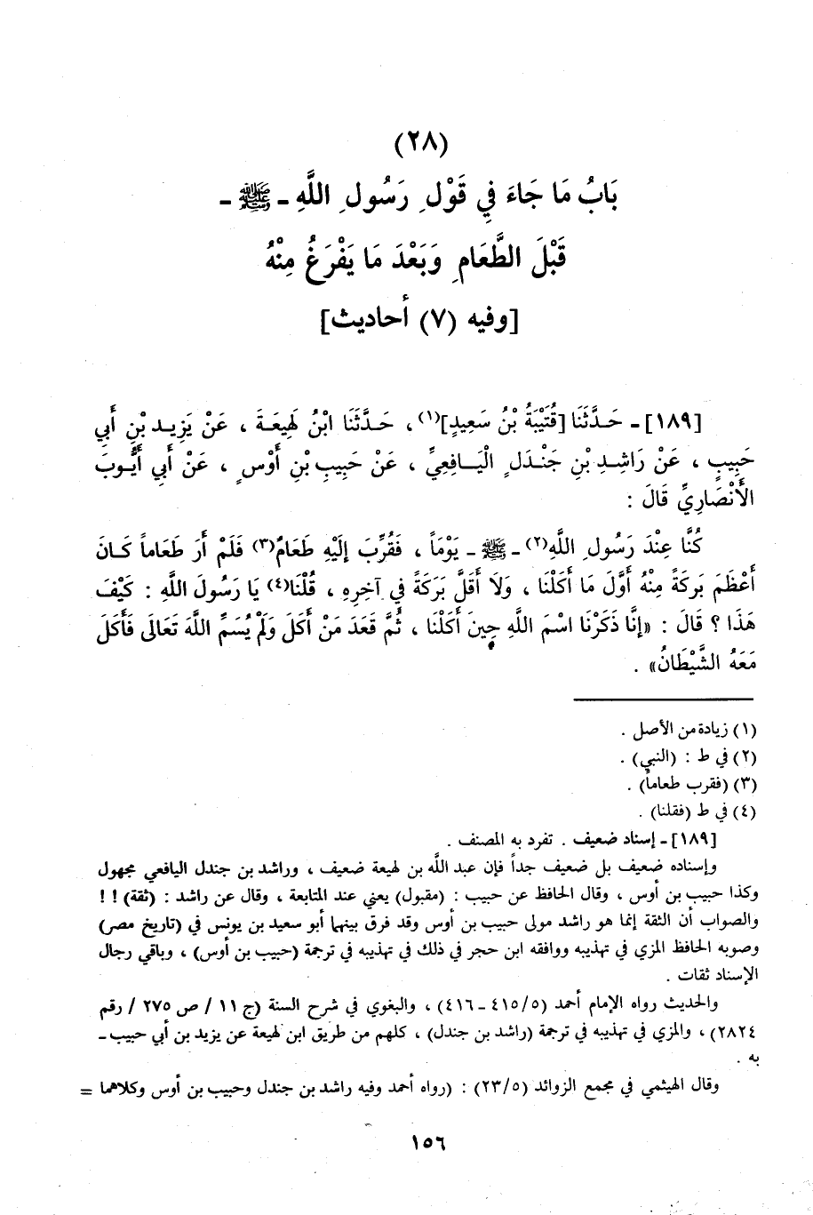 189 - حَدَّثَنَا قُتَيْبَةُ قَالَ: حَدَّثَنَا ابْنُ لَهِيعَةَ، عَنْ يَزِيدَ بْنِ أَبِي حَبِيبٍ، عَنْ رَاشِدِ بْنِ جَنْدَلٍ الْيَافِعِيِّ، عَنْ حَبِيبِ بْنِ أَوْسٍ، عَنْ أَبِي أَيُّوبَ الْأَنْصَارِيِّ قَالَ: كُنَّا عِنْدَ النَّبِيِّ صَلَّى اللهُ عَلَيْهِ وَسَلَّمَ يَوْمًا، فَقَرَّبَ طَعَامًا، فَلَمْ أَرَ طَعَامًا كَانَ أَعْظَمَ بَرَكَةً مِنْهُ، أَوَّلَ مَا أَكَلْنَا، وَلَا أَقَلَّ بَرَكَةً فِي آخِرِهِ، فَقُلْنَا: يَا رَسُولَ اللَّهِ، كَيْفَ هَذَا؟ قَالَ: «§إِنَّا ذَكَرْنَا اسْمَ اللَّهِ حِينَ أَكَلْنَا، ثُمَّ قَعَدَ مَنْ أَكَلَ وَلَمْ يُسَمِّ اللَّهَ تَعَالَى فَأَكَلَ مَعَهُ الشَّيْطَانُ»
