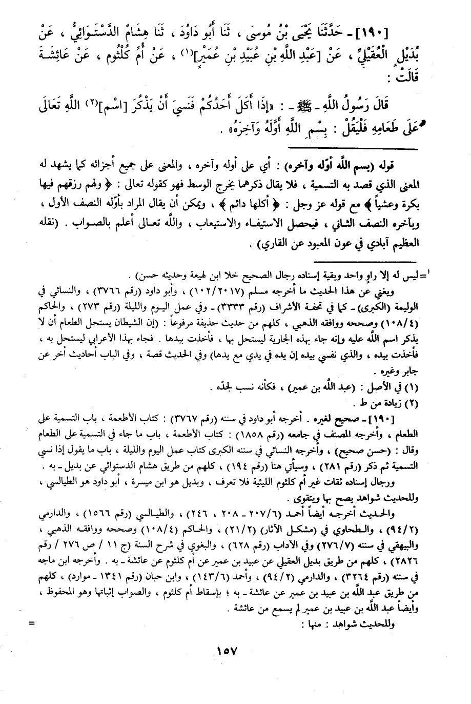 190 - حَدَّثَنَا يَحْيَى بْنُ مُوسَى قَالَ: حَدَّثَنَا أَبُو دَاوُدَ قَالَ: حَدَّثَنَا هِشَامٌ الدَّسْتُوائِيُّ، عَنْ بُدَيْلٍ الْعُقَيْلِيُّ، عَنْ عَبْدِ اللَّهِ بْنِ عُبَيْدِ بْنِ عُمَيْرٍ، عَنْ أُمِّ كُلْثُومٍ، عَنْ عَائِشَةَ، قَالَتْ: قَالَ رَسُولُ اللَّهِ صَلَّى اللهُ عَلَيْهِ وَسَلَّمَ: " §إِذَا أَكَلَ أَحَدُكُمْ فَنَسِيَ أَنْ يَذْكُرَ اللَّهَ تَعَالَى عَلَى طَعَامِهِ فَلْيَقُلْ: بِسْمِ اللَّهِ أَوَّلَهُ وَآخِرَهُ "