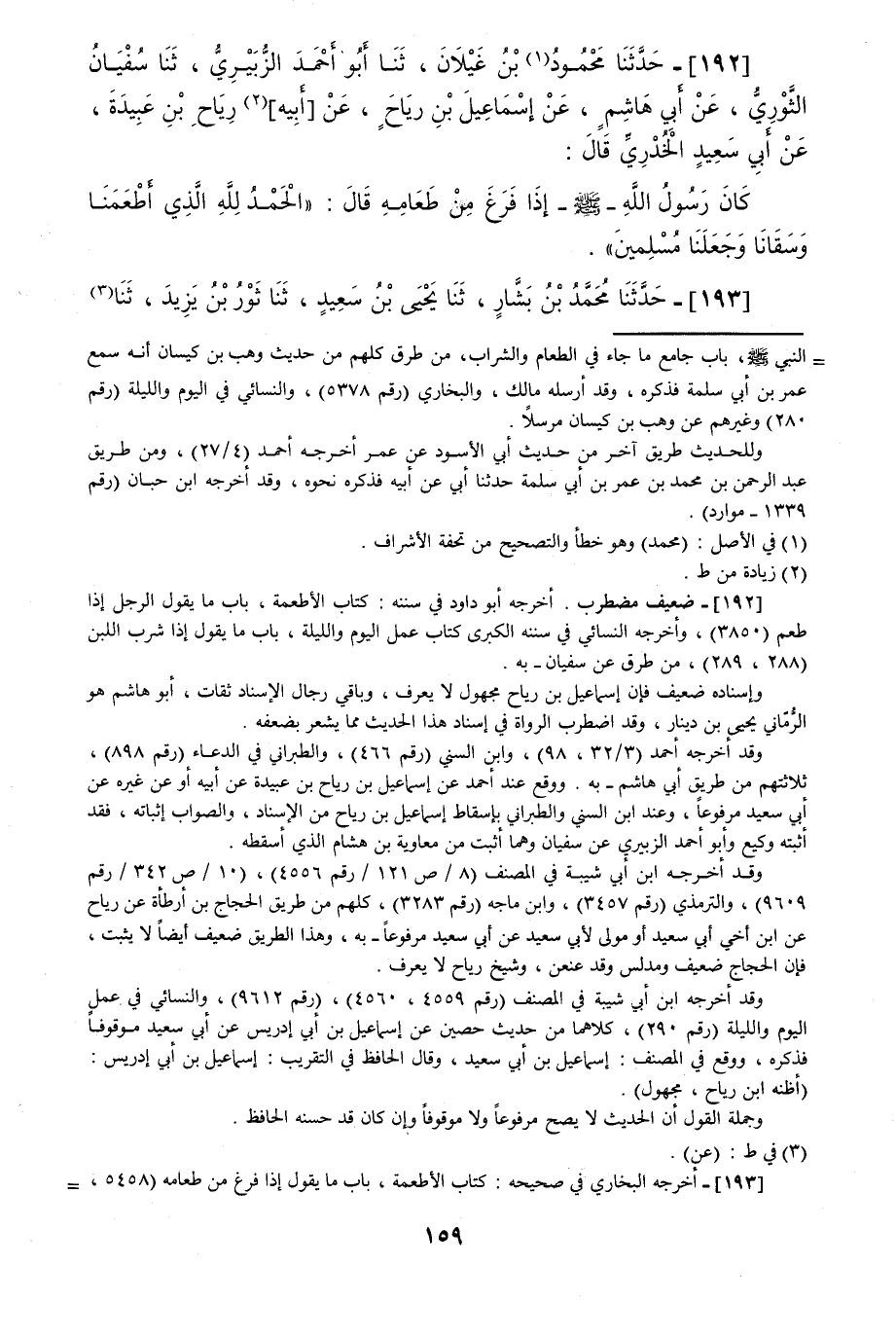 192 - حَدَّثَنَا مَحْمُودُ بْنُ غَيْلَانَ قَالَ: حَدَّثَنَا أَبُو أَحْمَدَ الزُّبَيْرِيُّ قَالَ: حَدَّثَنَا سُفْيَانُ الثَّوْرِيُّ، عَنْ أَبِي هَاشِمٍ، عَنِ إِسْمَاعِيلَ بْنِ رِيَاحٍ، عَنْ أَبِيهِ رِيَاحِ بْنِ عَبِيدَةَ، عَنْ أَبِي سَعِيدٍ الْخُدْرِيِّ قَالَ: كَانَ رَسُولُ اللَّهِ صَلَّى اللهُ عَلَيْهِ وَسَلَّمَ إِذَا فَرَغَ مِنْ طَعَامِهِ قَالَ: «§الْحَمْدُ لِلَّهِ الَّذِي أَطْعَمَنَا وَسَقَانَا وَجَعَلَنَا مُسْلِمِينَ»
