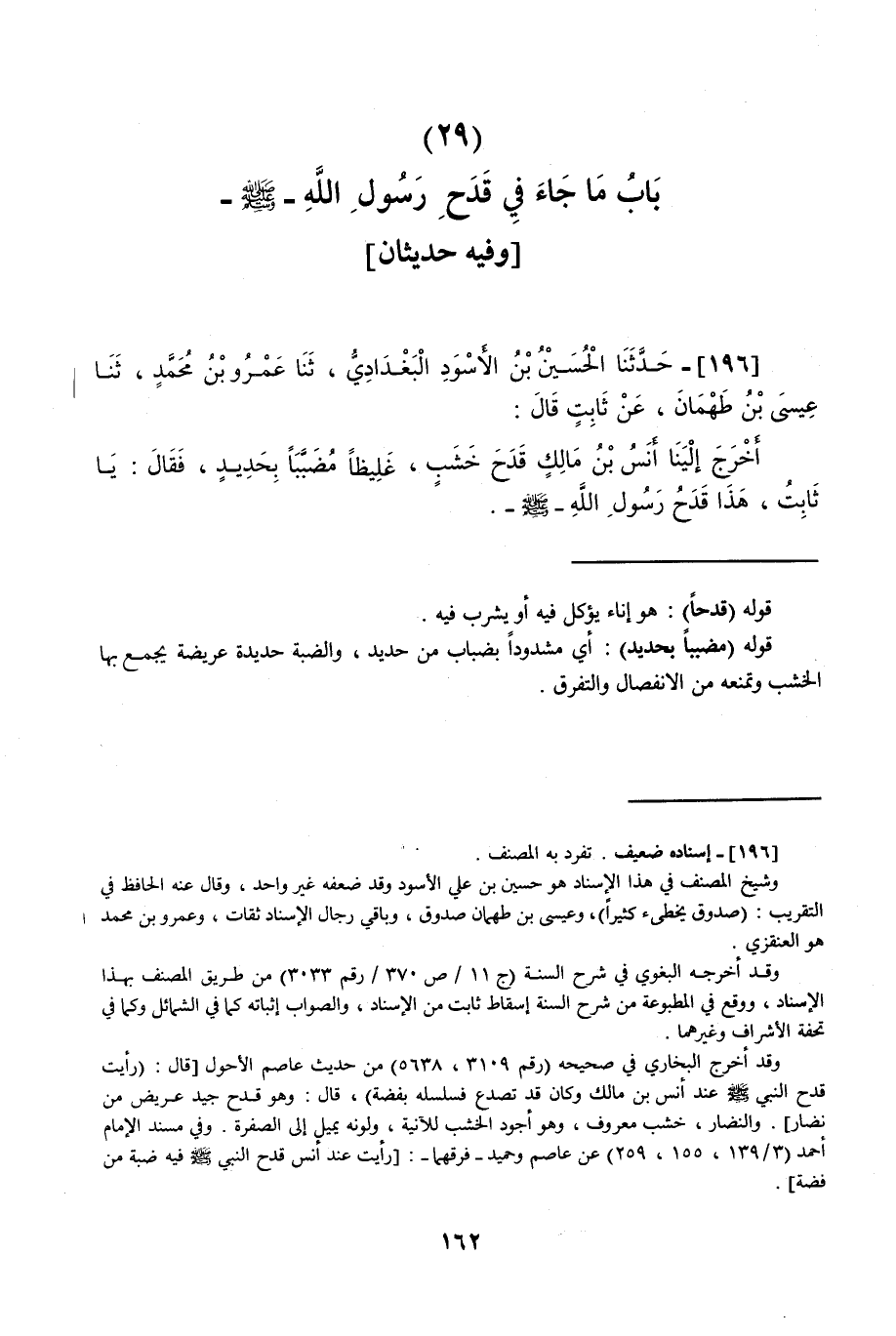 196 - حَدَّثَنَا الْحُسَيْنُ بْنُ الْأَسْوَدِ الْبَغْدَادِيُّ قَالَ: حَدَّثَنَا عَمْرُو بْنُ مُحَمَّدٍ قَالَ: حَدَّثَنَا عِيسَى بْنُ طَهْمَانَ، عَنْ ثَابِتٍ قَالَ: أَخَرَجَ إِلَيْنَا أَنَسُ بْنُ مَالِكٍ، §قَدَحَ خَشَبٍ غَلِيظًا مُضَبَّبًا بِحَدِيدٍ فَقَالَ: «يَا ثَابِتُ، هَذَا قَدَحُ رَسُولِ اللَّهِ صَلَّى اللهُ عَلَيْهِ وَسَلَّمَ»
