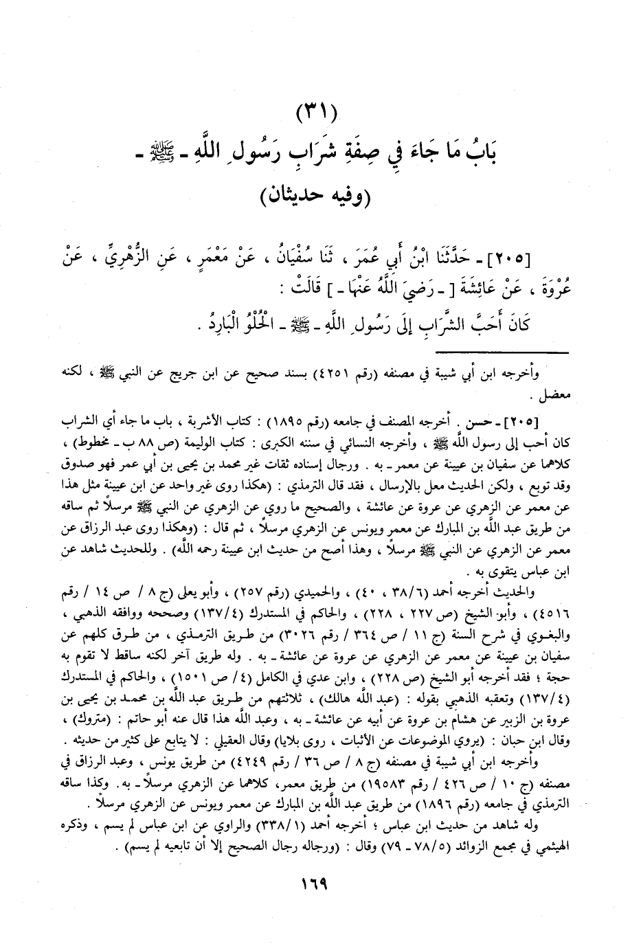 205 - حَدَّثَنَا ابْنُ أَبِي عُمَرَ قَالَ: حَدَّثَنَا سُفْيَانُ، عَنْ مَعْمَرٍ، عَنِ الزُّهْرِيِّ، عَنْ عُرْوَةَ، عَنْ عَائِشَةَ، قَالَتْ: «كَانَ §أَحَبَّ الشَّرَابِ إِلَى رَسُولِ اللَّهِ صَلَّى اللهُ عَلَيْهِ وَسَلَّمَ الْحُلْوُ الْبَارِدُ»