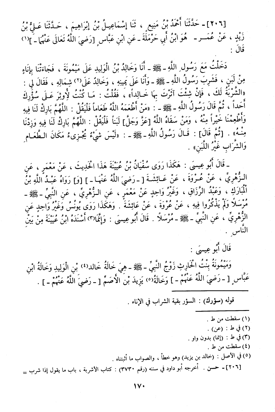 206 - حَدَّثَنَا أَحْمَدُ بْنُ مَنِيعٍ قَالَ: حَدَّثَنَا إِسْمَاعِيلُ بْنُ إِبْرَاهِيمَ قَالَ: حَدَّثَنَا عَلِيُّ بْنُ زَيْدٍ، عَنْ عُمَرَ هُوَ ابْنُ أَبِي حَرْمَلَةَ، عَنِ ابْنِ عَبَّاسٍ قَالَ: دَخَلْتُ مَعَ رَسُولِ اللَّهِ صَلَّى اللهُ عَلَيْهِ وَسَلَّمَ أَنَا وَخَالِدُ بْنُ الْوَلِيدِ عَلَى مَيْمُونَةَ فَجَاءَتْنَا بِإِنَاءٍ مِنْ لَبَنٍ، فَشَرِبَ رَسُولُ اللَّهِ صَلَّى اللهُ عَلَيْهِ وَسَلَّمَ وَأَنَا عَلَى يَمِينِهِ وَخَالِدٌ عَلَى شِمَالِهِ، فَقَالَ لِي: «الشَّرْبَةُ لَكَ، فَإِنْ شِئِتَ آثَرْتَ بِهَا خَالِدًا» فَقُلْتُ: مَا كُنْتُ لِأُوثِرَ عَلَى سُؤْرِكَ أَحدًا، ثُمَّ قَالَ رَسُولُ اللَّهِ صَلَّى اللهُ عَلَيْهِ وَسَلَّمَ: " §مَنْ أَطْعَمَهُ اللَّهُ طَعَامًا، فَلْيَقُلِ: اللَّهُمَّ بَارِكْ لَنَا فِيهِ وَأَطْعِمْنَا خَيْرًا مِنْهُ، وَمَنْ سَقَاهُ اللَّهُ عَزَّ وَجَلَّ لَبَنًا، فَلْيَقُلِ: اللَّهُمَّ بَارِكْ لَنَا فِيهِ وَزِدْنَا مِنْهُ ". ثُمَّ قَالَ: قَالَ رَسُولُ اللَّهِ صَلَّى اللهُ عَلَيْهِ وَسَلَّمَ: «لَيْسَ شَيْءٌ يُجْزِئُ مَكَانَ الطَّعَامِ وَالشَّرَابِ غَيْرُ اللَّبَنِ» قَالَ أَبُو عِيسَى: هَكَذَا رَوَى سُفْيَانُ بْنُ عُيَيْنَةَ، هَذَا الْحَدِيثَ، عَنْ مَعْمَرٍ، عَنِ الزُّهْرِيِّ، عَنْ عُرْوَةَ، عَنْ عَائِشَةَ، وَرَوَاهُ عَبْدُ اللَّهِ بْنُ الْمُبَارِكِ، وَعَبْدُ الرَّزَّاقِ، وَغَيْرُ وَاحِدٍ، عَنْ مَعْمَرٍ، عَنِ الزُّهْرِيِّ، عَنِ النَّبِيِّ صَلَّى اللهُ عَلَيْهِ وَسَلَّمَ «مُرْسَلًا وَلَمْ يَذْكُرُوا فِيهِ عَنْ عُرْوَةَ، عَنْ عَائِشَةَ، وَهَكَذَا رَوَى يُونُسُ وَغَيْرُ وَاحِدٍ، عَنِ الزُّهْرِيِّ، عَنِ النَّبِيِّ صَلَّى اللهُ عَلَيْهِ وَسَلَّمَ مُرْسَلًا» قَالَ أَبُو عِيسَى: «إِنَّمَا أَسْنَدَهُ ابْنُ عُيَيْنَةَ مِنْ بَيْنِ النَّاسِ» قَالَ أَبُو عِيسَى: " وَمَيْمُونَةُ بِنْتُ الْحَارِثِ زَوْجُ النَّبِيِّ صَلَّى اللهُ عَلَيْهِ وَسَلَّمَ هِيَ خَالَةُ خَالِدِ بْنِ الْوَلِيدِ، وَخَالَةُ ابْنِ عَبَّاسٍ، وَخَالَةُ يَزِيدَ بْنِ الْأَصَمِّ -[171]-، وَاخْتَلَفَ النَّاسُ فِي رِوَايَةِ هَذَا الْحَدِيثِ، عَنْ عَلِيِّ بْنِ زَيْدِ بْنِ جُدْعَانَ، فَرَوَى بَعْضُهُمْ عَنْ عَلِيِّ بْنِ زَيْدٍ، عَنْ عُمَرَ بْنِ أَبِي حَرْمَلَةَ، وَرَوَى شُعْبَةُ، عَنْ عَلِيِّ بْنِ زَيْدٍ، فَقَالَ: عَنْ عَمْرِو بْنِ حَرْمَلَةَ، وَالصَّحِيحُ عُمَرُ بْنُ أَبِي حَرْمَلَةَ "