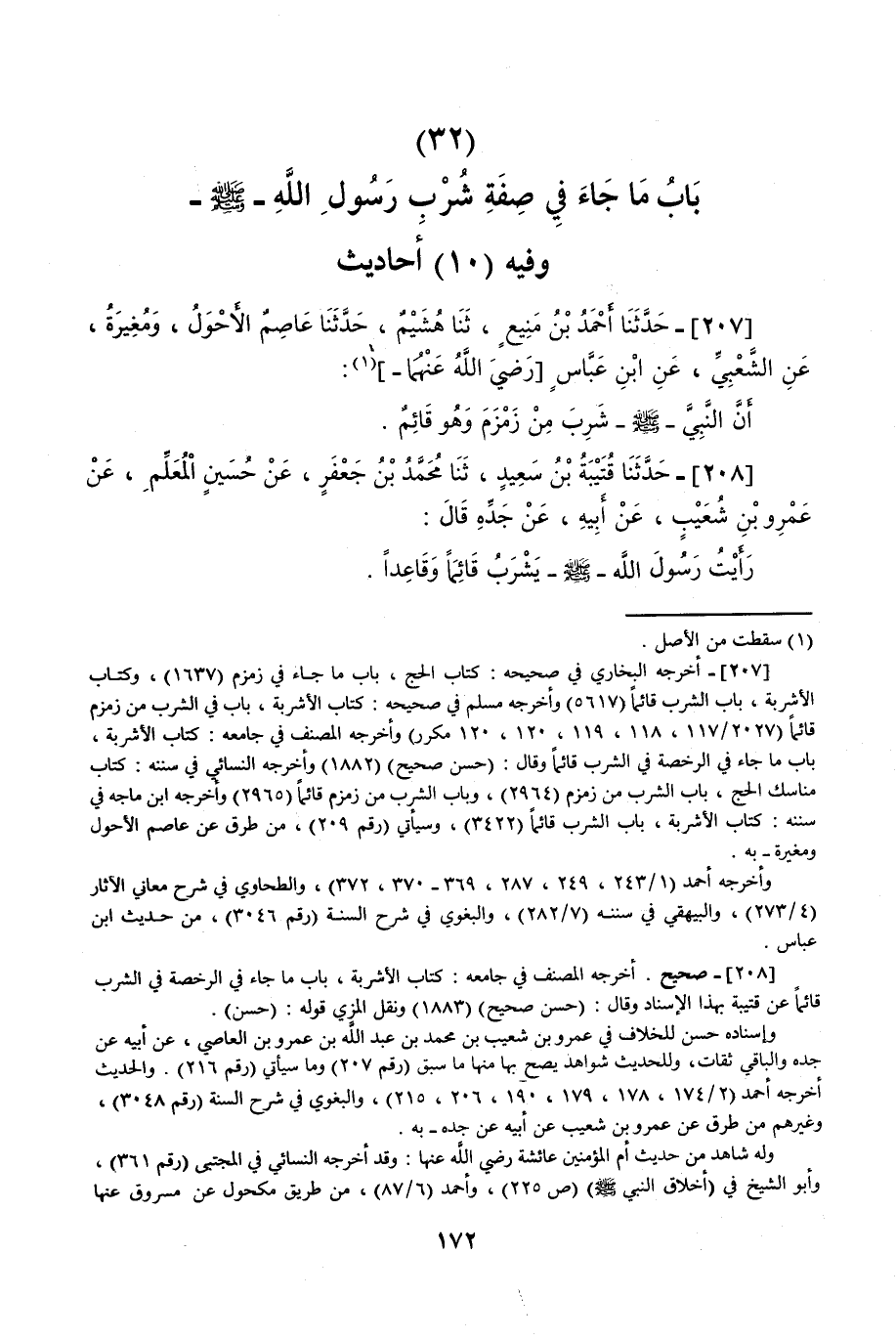 208 - حَدَّثَنَا قُتَيْبَةُ بْنُ سَعِيدٍ قَالَ: حَدَّثَنَا مُحَمَّدُ بْنُ جَعْفَرٍ، عَنْ حُسَيْنٍ الْمُعَلِّمِ، عَنْ عَمْرِو بْنِ شُعَيْبٍ، عَنْ أَبِيهِ، عَنْ جَدِّهِ قَالَ: «رَأَيْتُ رَسُولَ اللَّهِ صَلَّى اللهُ عَلَيْهِ وَسَلَّمَ §يَشْرَبُ قَائِمًا وَقَاعِدًا»