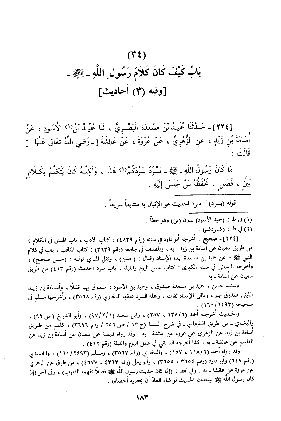 224 - حَدَّثَنَا حُمَيْدُ بْنُ مَسْعَدَةَ الْبَصْرِيُّ قَالَ: حَدَّثَنَا حُمَيْدُ بْنُ الْأَسْوَدِ، عَنِ أُسَامَةَ بْنِ زَيْدٍ، عَنِ الزُّهْرِيِّ، عَنْ عُرْوَةَ، عَنْ عَائِشَةَ، قَالَتْ: «مَا كَانَ رَسُولُ اللَّهِ صَلَّى اللهُ عَلَيْهِ وَسَلَّمَ يَسْرُدُ سرْدَكُمْ هَذَا، وَلَكِنَّهُ كَانَ §يَتَكَلَّمُ بِكَلَامٍ بَيِّنٍ فَصْلٍ، يَحْفَظُهُ مَنْ جَلَسَ إِلَيْهِ»