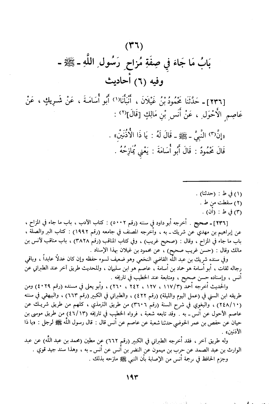 236 - حَدَّثَنَا مَحْمُودُ بْنُ غَيْلَانَ قَالَ: حَدَّثَنَا أَبُو أُسَامَةَ، عَنْ شَرِيكٍ، عَنْ عَاصِمٍ الْأَحْوَلِ، عَنْ أَنَسِ بْنِ مَالِكٍ أَنَّ النَّبِيَّ صَلَّى اللهُ عَلَيْهِ وَسَلَّمَ قَالَ لَهُ: «§يَا ذَا الْأُذُنَيْنِ» قَالَ مَحْمُودٌ: قَالَ أَبُو أُسَامَةَ: «يَعْنِي يُمَازِحُهُ»