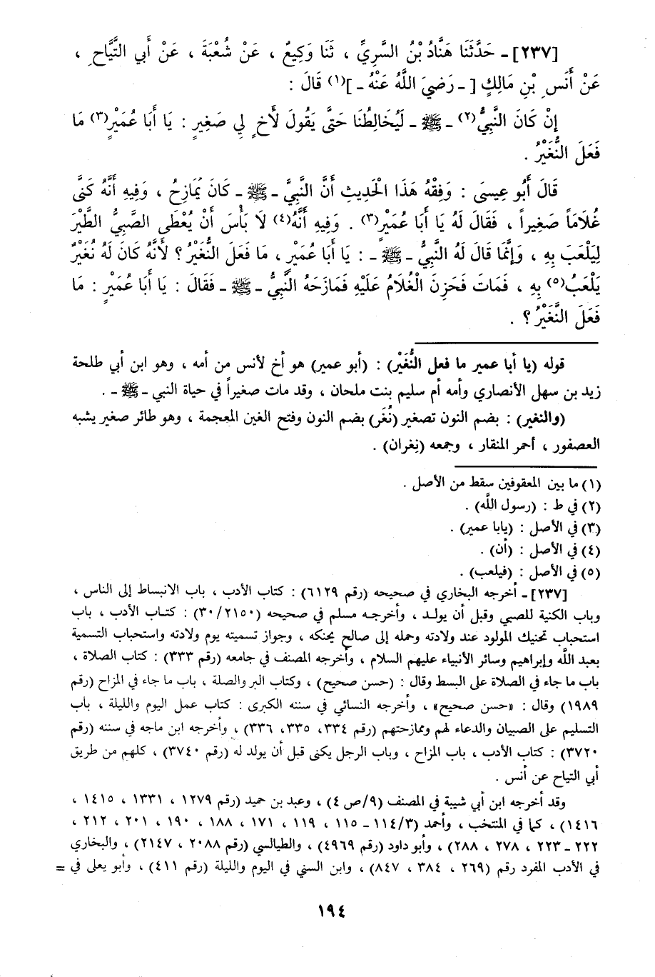 237 - حَدَّثَنَا هَنَّادُ بْنُ السَّرِيِّ قَالَ: حَدَّثَنَا وَكِيعٌ، عَنْ شُعْبَةَ، عَنْ أَبِي التَّيَّاحِ، عَنْ أَنَسِ بْنِ مَالِكٍ قَالَ: إِنْ كَانَ رَسُولُ اللَّهِ صَلَّى اللهُ عَلَيْهِ وَسَلَّمَ لَيُخَالِطُنَا حَتَّى يَقُولَ لِأَخٍ لِي صَغِيرٍ: «§يَا أَبَا عُمَيْرٍ، مَا فَعَلَ النُّغَيْرُ؟» قَالَ أَبُو عِيسَى: " وَفِقْهُ هَذَا الْحَدِيثِ أَنَّ النَّبِيَّ صَلَّى اللهُ عَلَيْهِ وَسَلَّمَ كَانَ يُمَازِحُ وَفِيهِ أَنَّهُ كَنَّى غُلَامًا صَغِيرًا فَقَالَ لَهُ: يَا أَبَا عُمَيْرٍ. وَفِيهِ أَنَّهُ لَا بَأْسَ أَنْ يُعْطَى الصَّبِيُّ الطَّيْرَ لِيَلْعَبَ بِهِ. وَإِنَّمَا قَالَ لَهُ النَّبِيُّ صَلَّى اللهُ عَلَيْهِ وَسَلَّمَ: «يَا أَبَا عُمَيْرٍ، مَا فَعَلَ النُّغَيْرُ؟» لِأَنَّهُ كَانَ لَهُ نُغَيْرٌ يَلْعَبُ بِهِ فَمَاتَ، فَحَزِنَ الْغُلَامُ عَلَيْهِ فَمَازَحَهُ النَّبِيُّ صَلَّى اللهُ عَلَيْهِ وَسَلَّمَ: «يَا أَبَا عُمَيْرٍ، مَا فَعَلَ النُّغَيْرُ؟»