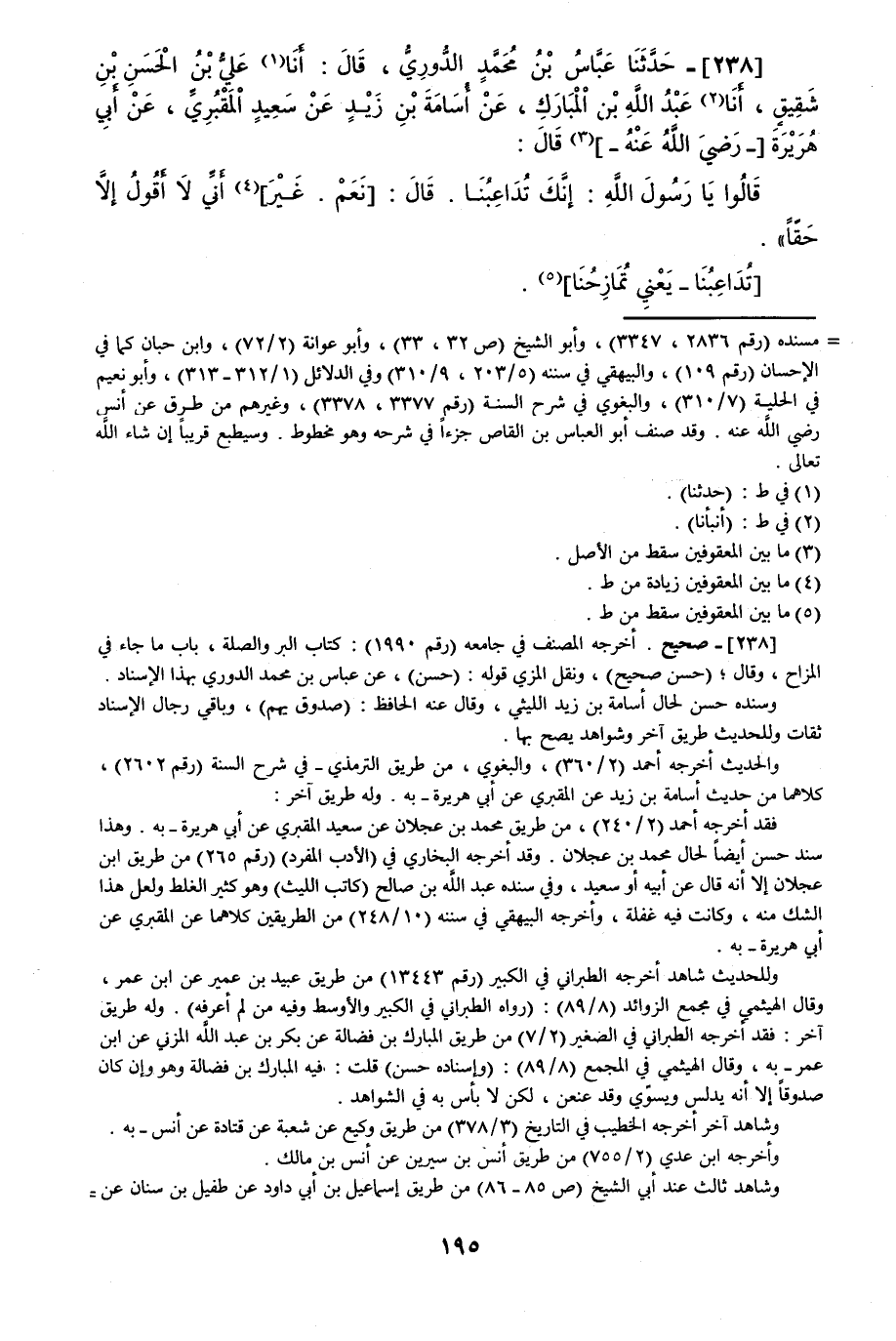 238 - حَدَّثَنَا عَبَّاسُ بْنُ مُحَمَّدٍ الدُّورِيُّ قَالَ: حَدَّثَنَا عَلِيُّ بْنُ الْحَسَنِ بْنِ شَقِيقٍ قَالَ: أَنبأَنَا عَبْدُ اللَّهِ بْنُ الْمُبَارِكِ، عَنِ أُسَامَةَ بْنِ زَيْدٍ، عَنْ سَعِيدٍ الْمَقْبُرِيِّ، عَنْ أَبِي هُرَيْرَةَ قَالَ: قَالُوا: يَا رَسُولَ اللَّهِ إِنَّكَ تُدَاعِبُنَا قَالَ: «§إِنِّي لَا أَقُولُ إِلَا حَقًّا»