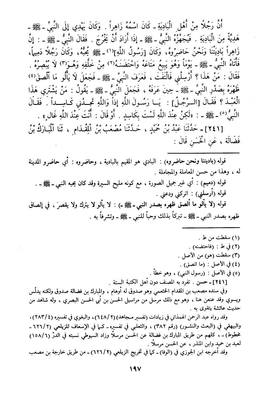 241 - حَدَّثَنَا عَبْدُ بْنُ حُمَيْدٍ قَالَ: حَدَّثَنَا مُصْعَبُ بْنُ الْمِقْدَامِ قَالَ: حَدَّثَنَا الْمُبَارِكُ بْنُ فَضَالَةَ، عَنِ الْحَسَنِ قَالَ -[199]-: أَتَتْ عَجُوزٌ إِلَى النَّبِيِّ صَلَّى اللهُ عَلَيْهِ وَسَلَّمَ، فَقَالَتْ: يَا رَسُولَ اللَّهِ، ادْعُ اللَّهَ أَنْ يُدْخِلَنِي الْجَنَّةَ، فَقَالَ: «يَا أُمَّ فُلَانٍ، إِنَّ §الْجَنَّةَ لَا تَدْخُلُهَا عَجُوزٌ» قَالَ: فَوَلَّتْ تَبْكِي فَقَالَ: «أَخْبِرُوهَا أَنَّهَا لَا تَدْخُلُهَا وَهِيَ عَجُوزٌ» إِنَّ اللَّهَ تَعَالَى يَقُولُ: {إِنَّا أَنْشَأْنَاهُنَّ إِنْشَاءً فَجَعَلْنَاهُنَّ أَبْكَارًا عُرُبًا أَتْرَابًا} [الواقعة: 36]