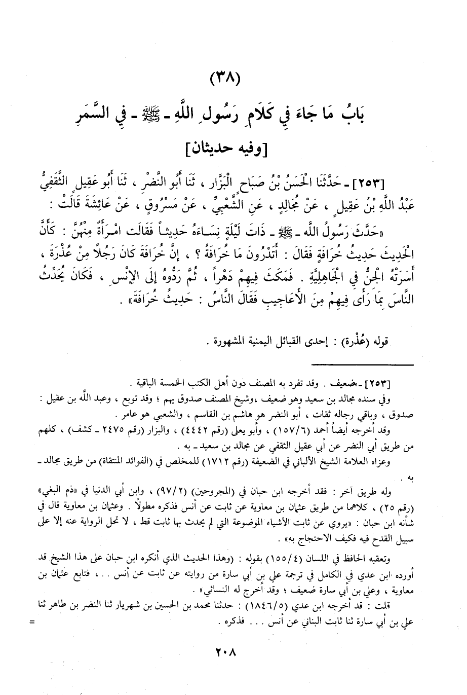 253 - حَدَّثَنَا الْحَسَنُ بْنُ صَبَّاحٍ الْبَزَّارُ قَالَ: حَدَّثَنَا أَبُو النَّضْرِ قَالَ: حَدَّثَنَا أَبُو عَقِيلٍ الثَّقَفِيُّ عَبْدُ اللَّهِ بْنُ عَقِيلٍ، عَنْ مُجَالِدٍ، عَنِ الشَّعْبِيِّ، عَنْ مَسْرُوقٍ، عَنْ عَائِشَةَ، قَالَتْ: حَدَّثَ رَسُولُ اللَّهِ صَلَّى اللهُ عَلَيْهِ وَسَلَّمَ ذَاتَ لَيْلَةٍ نِسَاءَهُ حَدِيثًا، فَقَالَتِ امْرَأَةٌ مِنْهُنَّ: كَأَنَّ الْحَدِيثَ حَدِيثُ خُرَافَةَ فَقَالَ: " §أَتَدْرُونَ مَا خُرَافَةُ؟ إِنَّ خُرَافَةَ كَانَ رَجُلًا مِنْ عُذْرَةَ، أَسَرَتْهُ الْجِنُّ فِي الْجَاهِلِيَّةِ فَمَكَثَ فِيهِمْ دَهْرًا، ثُمَّ رَدُّوهُ إِلَى الْإِنْسِ فَكَانَ يُحَدِّثُ النَّاسَ بِمَا رَأَى فِيهِمْ مِنَ الْأَعَاجِيبِ، فَقَالَ النَّاسُ: حَدِيثُ خُرَافَةَ "