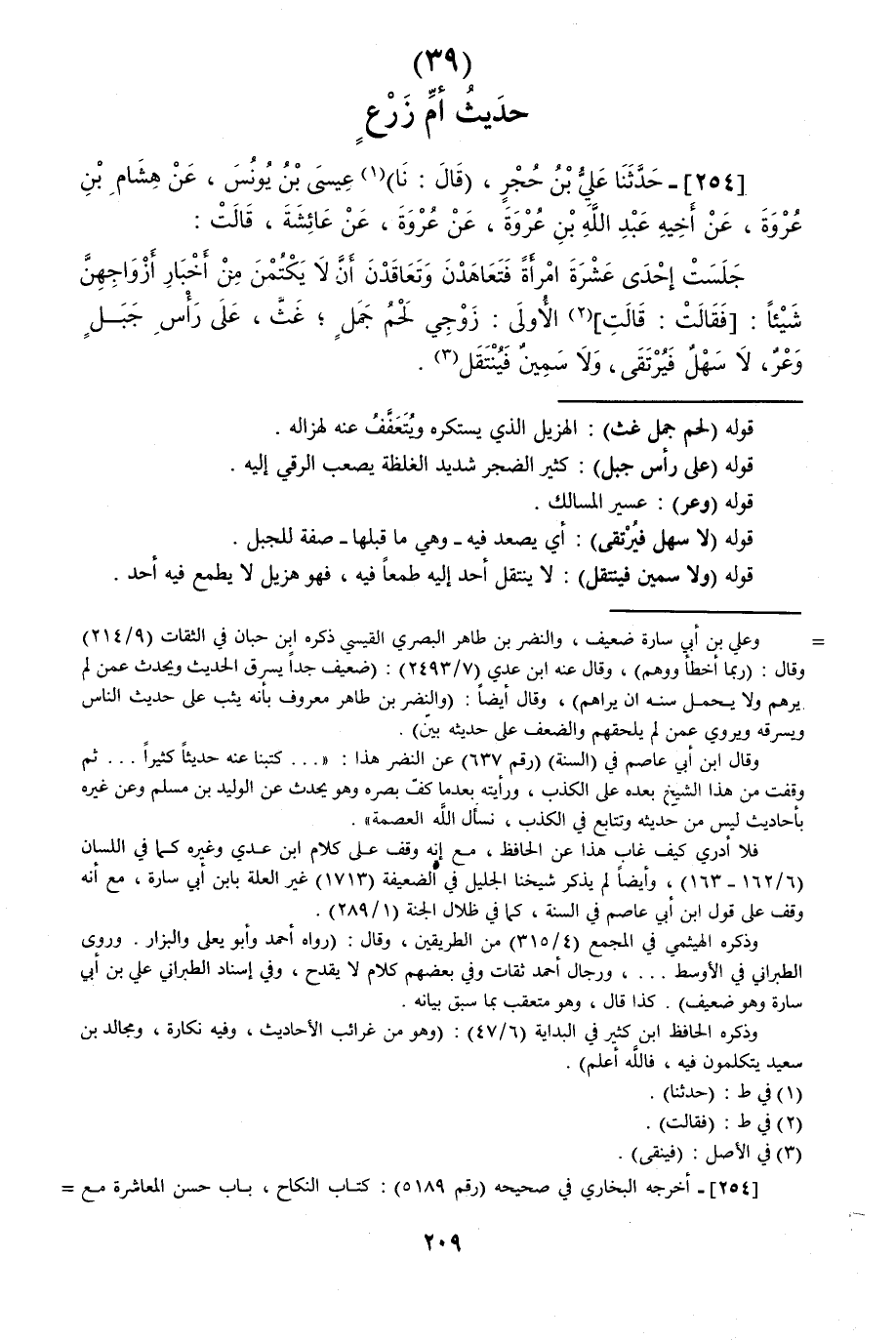 254 - حَدَّثَنَا عَلِيُّ بْنُ حُجْرٍ قَالَ: حَدَّثَنَا عِيسَى بْنُ يُونُسَ، عَنْ هِشَامِ بْنِ عُرْوَةَ، عَنِ أَخِيهِ عَبْدِ اللَّهِ بْنِ عُرْوَةَ، عَنْ عُرْوَةَ، عَنْ عَائِشَةَ، قَالَتْ: جَلَسَتْ إِحْدَى عَشْرَةَ امْرَأَةً فَتَعَاهَدْنَ وَتَعَاقَدْنَ أَنْ لَا يَكْتُمْنَ مِنْ أَخْبَارِ أَزْوَاجِهِنَّ شَيْئًا: فَقَالَتِ الْأُولَى: زَوْجِي لَحْمُ جَمَلٍ غَثٍّ عَلَى رَأْسِ جَبَلٍ وَعْرٍ، لَا سَهْلٌ فَيُرْتَقَى، وَلَا سَمِينٌ فَيُنْتَقَلُ -[210]-. قَالَتِ الثَّانِيَةُ: زَوْجِي لَا أَبُثُّ خَبَرَهُ، إِنِّي أَخَافُ أَنْ لَا أَذَرَهُ، إِنْ أَذْكُرْهُ أَذْكُرْ عُجَرَهُ وَبُجَرَهُ. قَالَتِ الثَّالِثَةُ: زَوْجِي الْعَشَنَّقُ، إِنْ أَنْطِقْ أُطَلَّقْ، وَإِنْ أَسْكُتْ أُعَلَّقْ. قَالَتِ الرَّابِعَةُ: زَوْجِي كَلَيْلِ تِهَامَةَ، لَا حَرٌّ وَلَا قُرٌّ، وَلَا مَخَافَةَ وَلَا سَآمَةَ -[211]-. قَالَتِ الْخَامِسَةُ: زَوْجِي إِنْ دَخَلَ فَهِدَ، وَإِنْ خَرَجَ أَسِدَ، وَلَا يَسْأَلُ عَمَّا عَهِدَ. قَالَتِ السَّادِسَةُ: زَوْجِي إِنْ أَكَلَ لَفَّ، وَإِنْ شَرِبَ اشْتَفَّ، وَإِنِ اضْطَجَعَ الْتَفَّ، وَلَا يُولِجُ الْكَفَّ لِيَعْلَمَ الْبَثَّ. قَالَتِ السَّابِعَةُ: زَوْجِي عَيَايَاءُ أَوْ غَيَايَاءُ طَبَاقَاءُ كُلُّ دَاءٍ لَهُ دَاءٌ، شَجَّكِ -[212]- أَوْ فَلَّكِ أَوْ جَمَعَ كُلًّا لَكِ. قَالَتِ الثَّامِنَةُ: زَوْجِي الْمَسُّ مَسُّ أَرْنَبٍ وَالرِّيحُ رِيحُ زَرْنَبٍ. قَالَتِ التَّاسِعَةُ: زَوْجِي رَفِيعُ الْعِمَادِ طَوِيلُ النِّجَادِ عَظِيمُ الرَّمَادِ قَرِيبُ الْبَيْتِ مِنَ النَّادِ. قَالَتِ الْعَاشِرَةُ: زَوْجِي مَالِكٌ وَمَا مَالِكٌ مَالِكٌ خَيْرٌ مِنْ ذَلِكِ، لَهُ إِبِلٌ -[213]- كَثِيرَاتُ الْمَبَارِكِ، قَلِيلَاتُ الْمَسَارِحِ، إِذَا سَمِعْنَ صَوْتَ الْمِزْهَرِ أَيْقَنَّ أَنَّهُنَّ هَوَالِكُ. قَالَتِ الْحَادِيَةَ عَشْرَةَ: زَوْجِي أَبُو زَرْعٍ وَمَا أَبُو زَرْعٍ؟ أَنَاسَ مِنْ حُلِيٍّ أُذُنَيَّ، وَمَلَأَ مِنْ شَحْمٍ عَضُدَيَّ، وَبَجَّحَنِي فَبَجَحَتْ إِلَيَّ نَفْسِي، وَجَدَنِي فِي أَهْلِ غُنَيْمَةٍ بِشِقٍّ فَجَعَلَنِي فِي أَهْلِ صَهِيلٍ وَأَطِيطٍ وَدَائِسٍ وَمُنَقٍّ، فَعِنْدَهُ أَقُولُ فَلَا أُقَبَّحُ -[214]-، وَأَرْقُدُ فَأَتَصَبَّحُ وَأَشْرَبُ فَأَتَقَمَّحُ، أُمُّ أَبِي زَرْعٍ فَمَا أُمُّ أَبِي زَرْعٍ، عُكُومُهَا رَدَاحٌ، وَبَيْتُهَا فَسَاحٌ، ابْنُ أَبِي زَرْعٍ، فَمَا ابْنُ أَبِي زَرْعٍ، مَضْجَعُهُ كَمَسَلِّ شَطْبَةٍ، وَتُشْبِعُهُ ذِرَاعُ الْجَفْرَةِ، بِنْتُ أَبِي زَرْعٍ، فَمَا بِنْتُ أَبِي زَرْعٍ، طَوْعُ أَبِيهَا وَطَوْعُ أُمِّهَا، مِلْءُ كِسَائِهَا، وَغَيْظُ جَارَتِهَا، جَارِيَةُ أَبِي زَرْعٍ، فَمَا جَارِيَةُ أَبِي زَرْعٍ، لَا تَبُثُّ حَدِيثَنَا تَبْثِيثًا، وَلَا تُنَقِّثُ مِيرَتَنَا تَنْقِيثًا، وَلَا تَمْلَأُ بَيْتَنَا تَعْشِيشًا، قَالَتْ: خَرَجَ أَبُو زَرْعٍ وَالْأَوْطَابُ تُمْخَضُ، فَلَقِيَ امْرَأَةً مَعَهَا وَلَدَانِ لَهَا -[215]- كَالْفَهْدَيْنِ، يَلْعَبَانِ مِنْ تَحْتِ خَصْرِهَا بِرُمَّانَتَيْنِ، فَطَلَّقَنِي وَنَكَحَهَا، فَنَكَحْتُ بَعْدَهُ رَجُلًا سَرِيًّا، رَكِبَ شَرِيًّا، وَأَخَذَ خَطِّيًّا، وَأَرَاحَ عَلَيَّ نَعَمًا ثَرِيًّا، وَأَعْطَانِي مِنْ كُلِّ رَائِحَةٍ زَوْجًا، وَقَالَ: كُلِي أُمَّ زَرْعٍ، وَمِيرِي أَهْلَكِ، فَلَوْ جَمَعْتُ كُلَّ شَيْءٍ أَعْطَانِيهِ، مَا بَلَغَ أَصْغَرَ آنِيَةِ أَبِي زَرْعٍ. قَالَتْ عَائِشَةُ: فَقَالَ لِي رَسُولُ اللَّهِ صَلَّى اللهُ عَلَيْهِ وَسَلَّمَ: «§كُنْتُ لَكِ كَأَبِي زَرْعٍ لِأُمِّ زَرْعٍ»