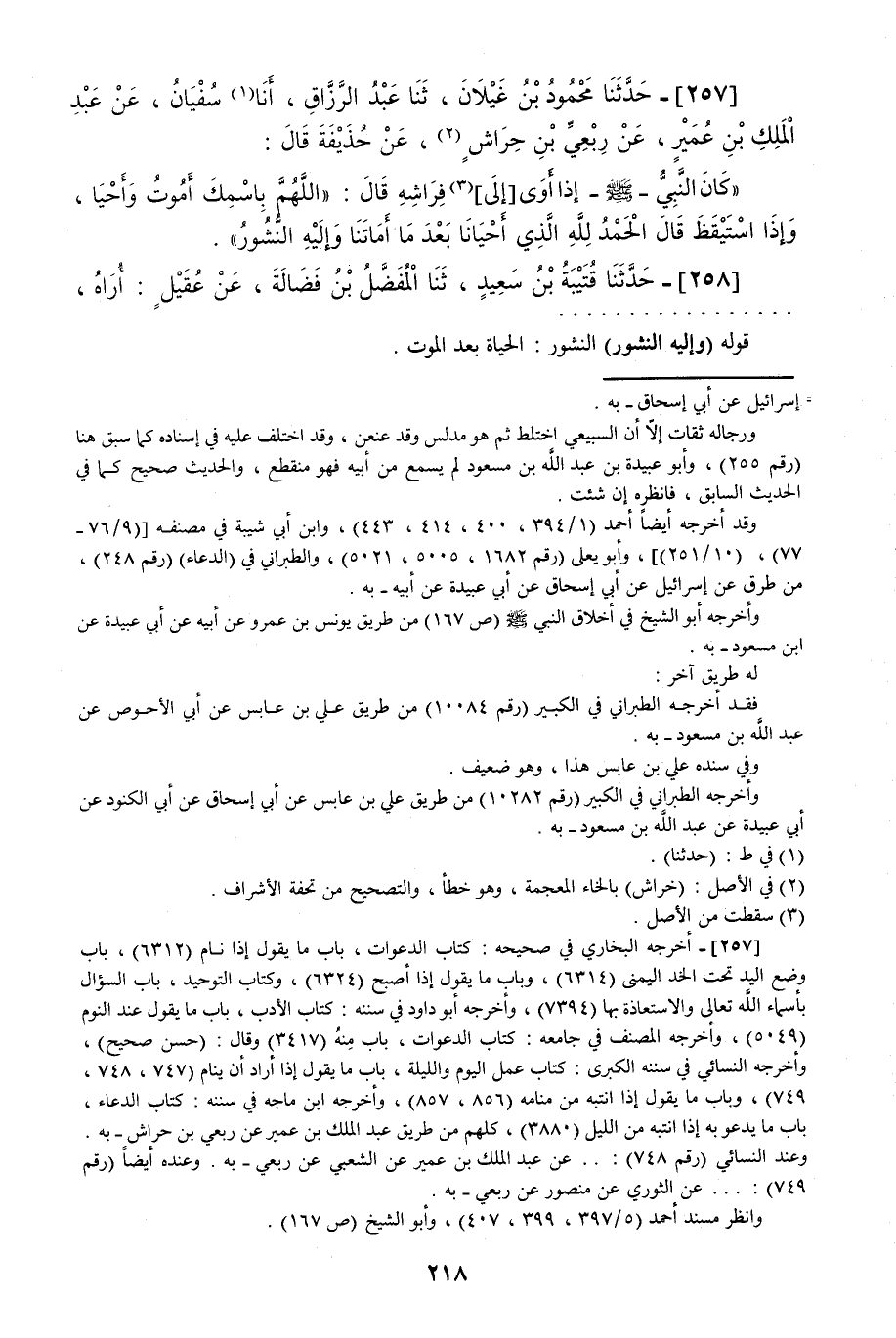257 - حَدَّثَنَا مَحْمُودُ بْنُ غَيْلَانَ قَالَ: حَدَّثَنَا عَبْدُ الرَّزَّاقِ قَالَ: حَدَّثَنَا سُفْيَانُ، عَنْ عَبْدِ الْمَلِكِ بْنِ عُمَيْرٍ، عَنْ رِبْعِيِّ بْنِ حِرَاشٍ، عَنْ حُذَيْفَةَ قَالَ: كَانَ النَّبِيُّ صَلَّى اللهُ عَلَيْهِ وَسَلَّمَ إِذَا أَوَى إِلَى فِرَاشِهِ قَالَ: «§اللَّهُمَّ بِاسْمِكَ أَمُوتُ وَأَحْيَا» ، وَإِذَا اسْتَيْقَظَ قَالَ: «الْحَمْدُ لِلَّهِ الَّذِي أَحْيَانًا بَعْدَمَا أَمَاتَنَا وَإِلَيْهِ النُّشُورُ»