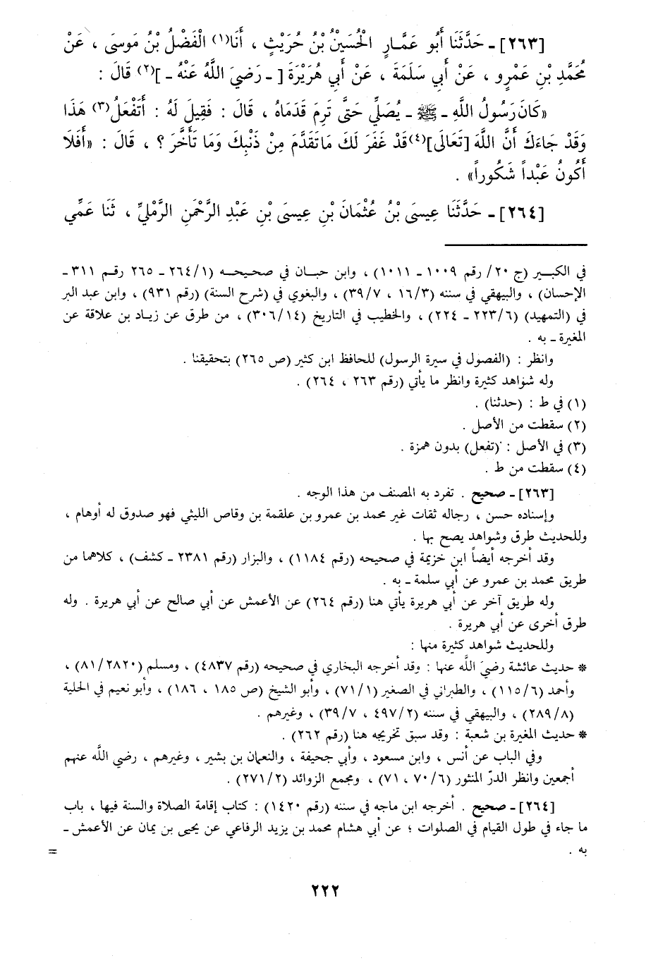 263 - حَدَّثَنَا أَبُو عَمَّارٍ الْحُسَيْنُ بْنُ حُرَيْثٍ قَالَ: حَدَّثَنَا الْفَضْلُ بْنُ مُوسَى، عَنْ مُحَمَّدِ بْنِ عَمْرٍو، عَنْ أَبِي سَلَمَةَ، عَنْ أَبِي هُرَيْرَةَ قَالَ: كَانَ رَسُولُ اللَّهِ صَلَّى اللهُ عَلَيْهِ وَسَلَّمَ يُصَلِّي حَتَّى تَرِمَ قَدَمَاهُ قَالَ: فَقِيلَ لَهُ: أَتَفْعَلُ هَذَا وَقَدْ جَاءَكَ أَنَّ اللَّهَ قَدْ غَفَرَ لَكَ مَا تَقَدَّمَ مِنْ ذَنْبِكَ وَمَا تَأَخَّرَ؟ قَالَ: «§أَفَلَا أَكُونُ عَبْدًا شَكُورًا»
