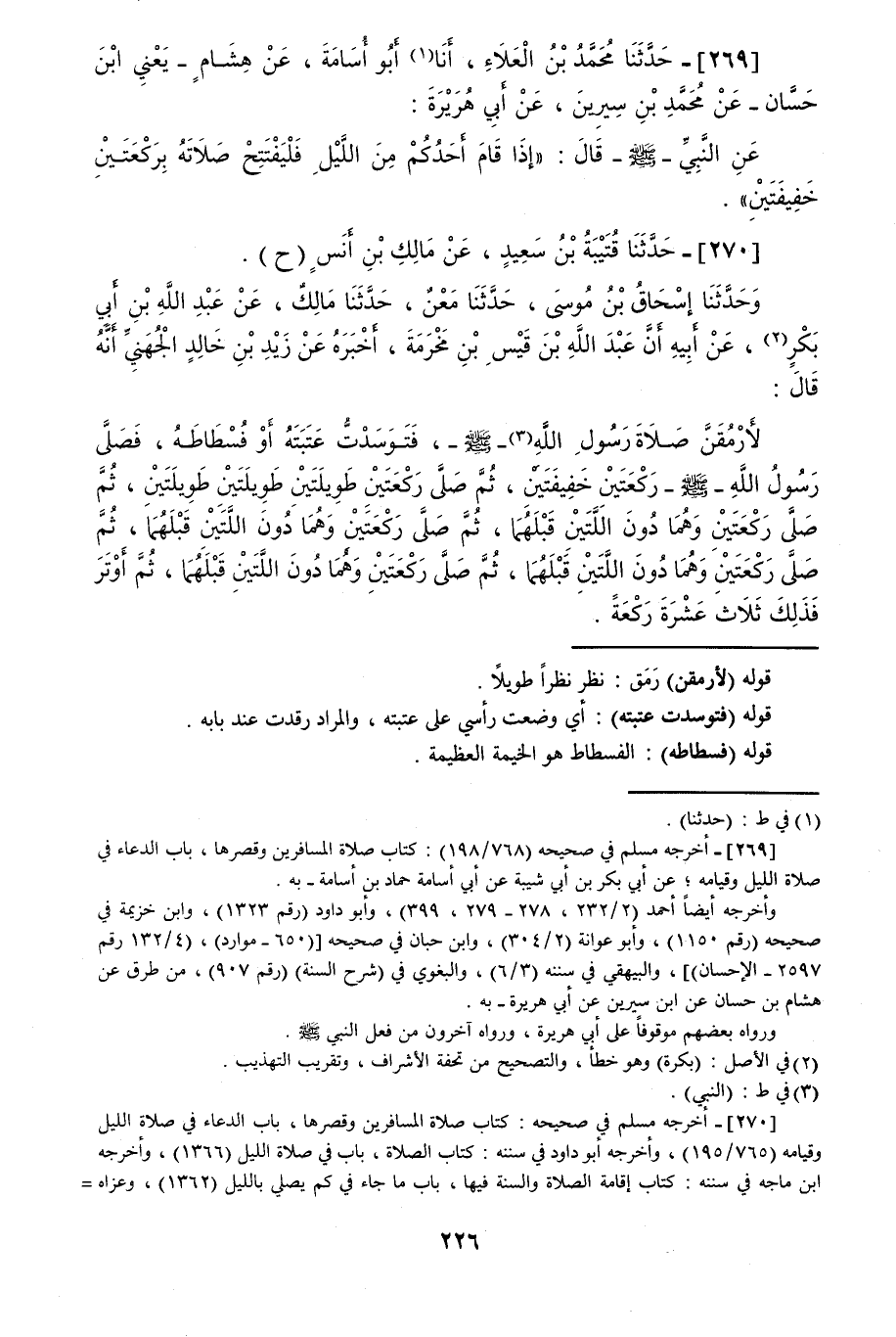 270 - حَدَّثَنَا قُتَيْبَةُ بْنُ سَعِيدٍ، عَنْ مَالِكِ بْنِ أَنَسٍ، ح وَحَدَّثَنَا إِسْحَاقُ بْنُ مُوسَى قَالَ: حَدَّثَنَا مَعْنٌ قَالَ: حَدَّثَنَا مَالِكٌ، عَنْ عَبْدِ اللَّهِ بْنِ أَبِي بَكْرٍ، عَنْ أَبِيهِ، أَنَّ عَبْدَ اللَّهِ بْنَ قَيْسِ بْنِ مَخْرَمَةَ، أَخْبَرَهُ عَنْ زَيْدِ بْنِ خَالِدٍ الْجُهَنِيِّ، أَنَّهُ قَالَ: لَأَرْمُقَنَّ صَلَاةَ النَّبِيِّ صَلَّى اللهُ عَلَيْهِ وَسَلَّمَ، فَتَوَسَّدْتُ عَتَبَتَهُ، أَوْ فُسْطَاطَهُ «§فَصَلَّى رَسُولُ اللَّهِ صَلَّى اللهُ عَلَيْهِ وَسَلَّمَ رَكْعَتَيْنِ خَفِيفَتَيْنِ، ثُمَّ صَلَّى رَكْعَتَيْنِ طَوِيلَتَيْنِ، طَوِيلَتَيْنِ، طَوِيلَتَيْنِ، ثُمَّ صَلَّى رَكْعَتَيْنِ وَهُمَا دَونَ اللَّتَيْنِ قَبْلَهُمَا، ثُمَّ صَلَّى رَكْعَتَيْنِ وَهُمَا دُونَ اللَّتَيْنِ قَبْلَهُمَا، ثُمَّ صَلَّى رَكْعَتَيْنِ وَهُمَا دُونَ اللَّتَيْنِ قَبْلَهُمَا، ثُمَّ صَلَّى رَكْعَتَيْنِ وَهُمَا دُونَ اللَّتَيْنِ قَبْلَهُمَا، ثُمَّ أَوْتَرَ فَذَلِكَ ثَلَاثَ عَشْرَةَ رَكْعَةً»