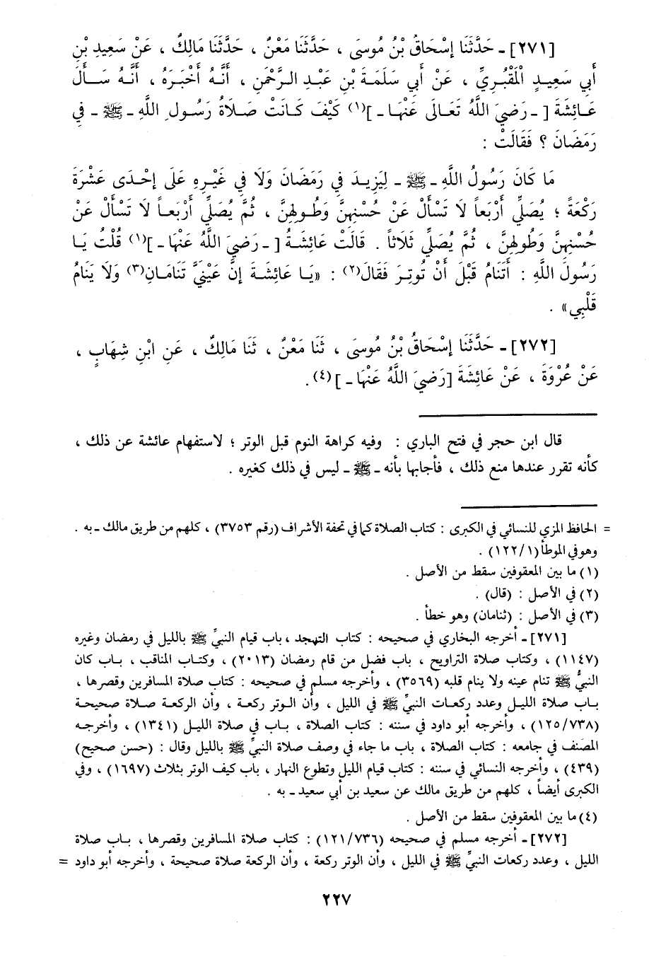 271 - حَدَّثَنَا إِسْحَاقُ بْنُ مُوسَى قَالَ: حَدَّثَنَا مَعْنٌ قَالَ: حَدَّثَنَا مَالِكٌ، عَنْ سَعِيدِ بْنِ أَبِي سَعِيدٍ الْمَقْبُرِيِّ، عَنْ أَبِي سَلَمَةَ بْنِ عَبْدِ الرَّحْمَنِ، أَنَّهُ أَخْبَرَهُ أَنَّهُ سَأَلَ عَائِشَةَ، كَيْفَ كَانَتْ صَلَاةُ رَسُولِ اللَّهِ صَلَّى اللهُ عَلَيْهِ وَسَلَّمَ فِي رَمَضَانَ؟ فَقَالَتْ: مَا كَانَ رَسُولُ اللَّهِ صَلَّى اللهُ عَلَيْهِ وَسَلَّمَ لِيَزِيدَ فِي رَمَضَانَ وَلَا فِي غَيْرِهِ عَلَى إِحْدَى عَشْرَةَ رَكْعَةً، يُصَلِّي أَرْبَعًا لَا تَسْأَلْ عَنْ حُسْنِهِنَّ وَطُولِهِنَّ، ثُمَّ يُصَلِّي أَرْبَعًا لَا تَسْأَلْ عَنْ حُسْنِهِنَّ وَطُولِهِنَّ، ثُمَّ يُصَلِّي ثَلَاثًا، قَالَتْ عَائِشَةُ: قُلْتُ: يَا رَسُولَ اللَّهِ، أَتَنَامُ قَبْلَ أَنْ تُوتِرَ؟ فَقَالَ: «يَا عَائِشَةُ، §إِنَّ عَيْنَيَّ تَنَامَانِ وَلَا يَنَامُ قَلْبِي»