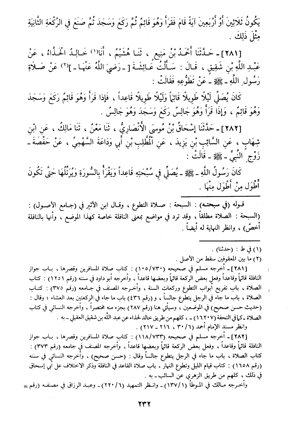 281 - حَدَّثَنَا أَحْمَدُ بْنُ مَنِيعٍ قَالَ: حَدَّثَنَا هُشَيْمٌ قَالَ: حَدَّثَنَا خَالِدٌ الْحَذَّاءُ، عَنْ عَبْدِ اللَّهِ بْنِ شَقِيقٍ قَالَ: سَأَلْتُ عَائِشَةَ، عَنْ صَلَاةِ رَسُولِ اللَّهِ صَلَّى اللهُ عَلَيْهِ وَسَلَّمَ عَنْ تَطَوُّعِهِ، فَقَالَتْ: «§كَانَ يُصَلِّي لَيْلًا طَوِيلًا قَائِمًا، وَلَيْلًا طَوِيلًا قَاعِدًا، فَإِذَا قَرَأَ وَهُوَ قَائِمٌ رَكَعَ وَسَجَدَ وَهُوَ قَائِمٌ، وَإِذَا قَرَأَ وَهُوَ جَالِسٌ رَكَعَ وَسَجَدَ وَهُوَ جَالِسٌ»