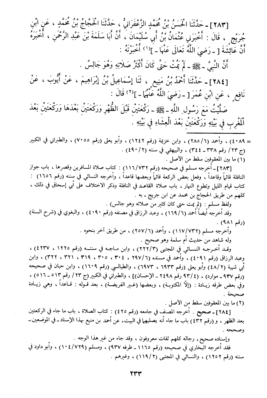 284 - حَدَّثَنَا أَحْمَدُ بْنُ مَنِيعٍ قَالَ: حَدَّثَنَا إِسْمَاعِيلُ بْنُ إِبْرَاهِيمَ قَالَ: حَدَّثَنَا أَيُّوبَ، عَنْ نَافِعٍ، عَنِ ابْنِ عُمَرَ قَالَ: «§صَلَّيْتُ مَعَ النَّبِيِّ صَلَّى اللهُ عَلَيْهِ وَسَلَّمَ رَكْعَتَيْنِ قَبْلَ الظُّهْرِ، وَرَكْعَتَيْنِ بَعْدَهَا، وَرَكْعَتَيْنِ بَعْدَ الْمَغْرِبِ فِي بَيْتِهِ، وَرَكْعَتَيْنِ بَعْدَ الْعِشَاءِ فِي بَيْتِهِ»